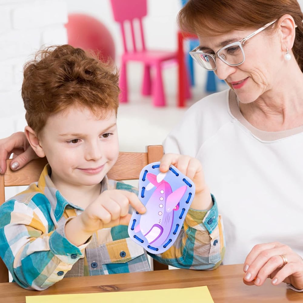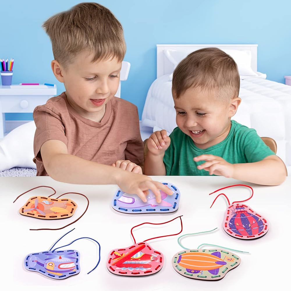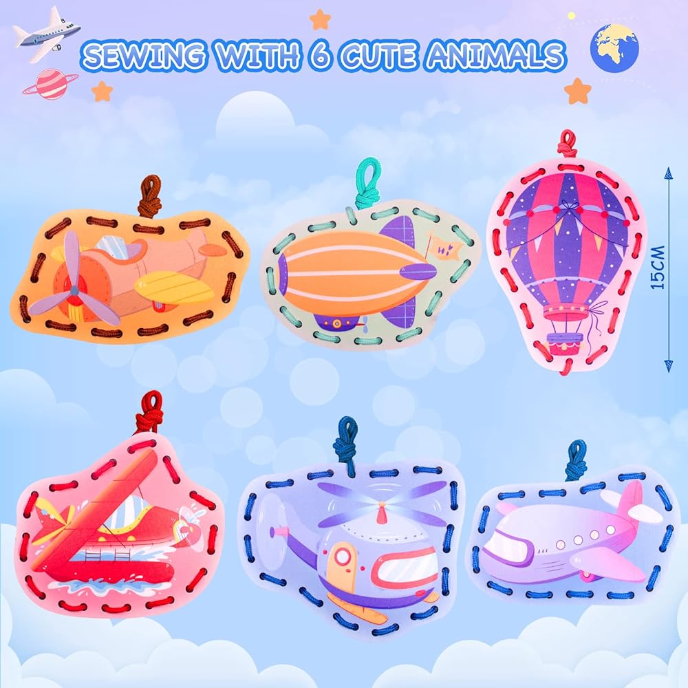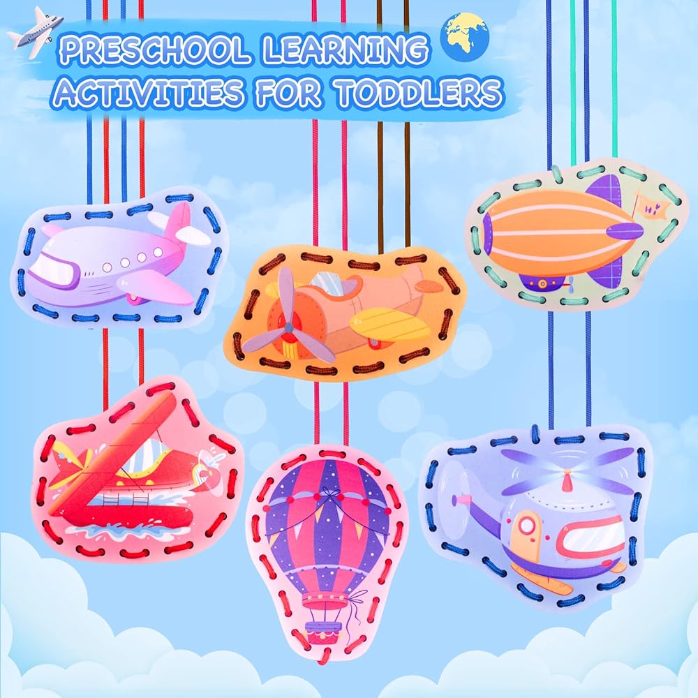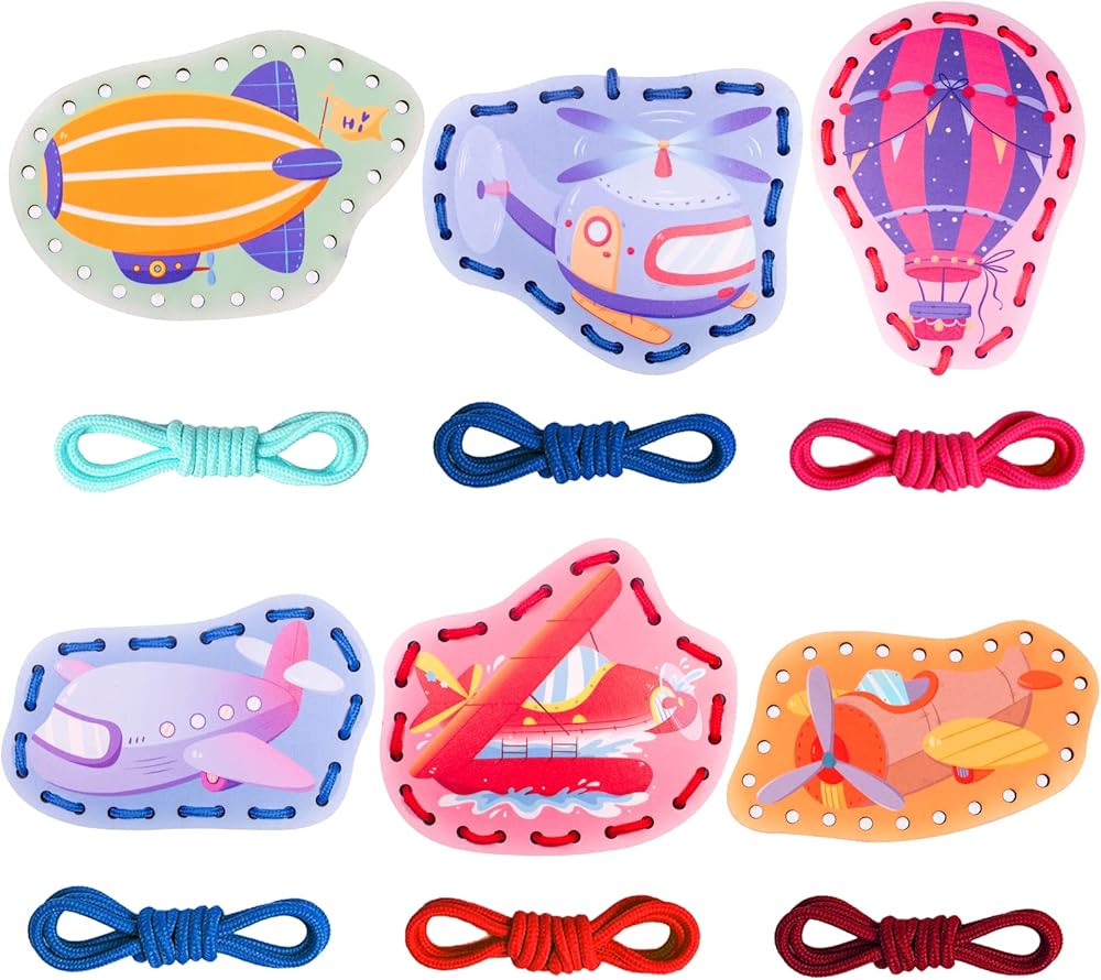 Zeoddler Wooden Aircraft Lacing Card for Kids 3-5, Sewing Cards for Toddlers, Art and Craft for Kids, Fine Motor Skill Toys, 6 Wooden Panels and 6 Matching Laces, Gift for Boys, Girls