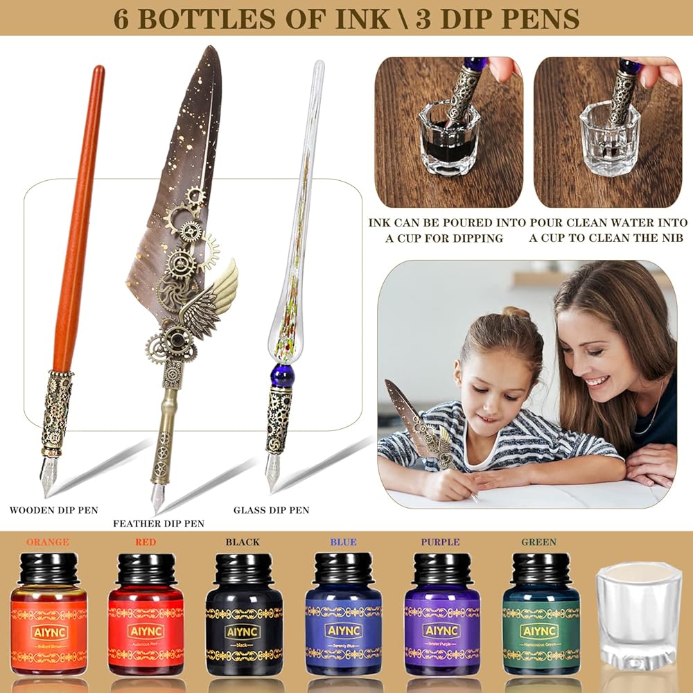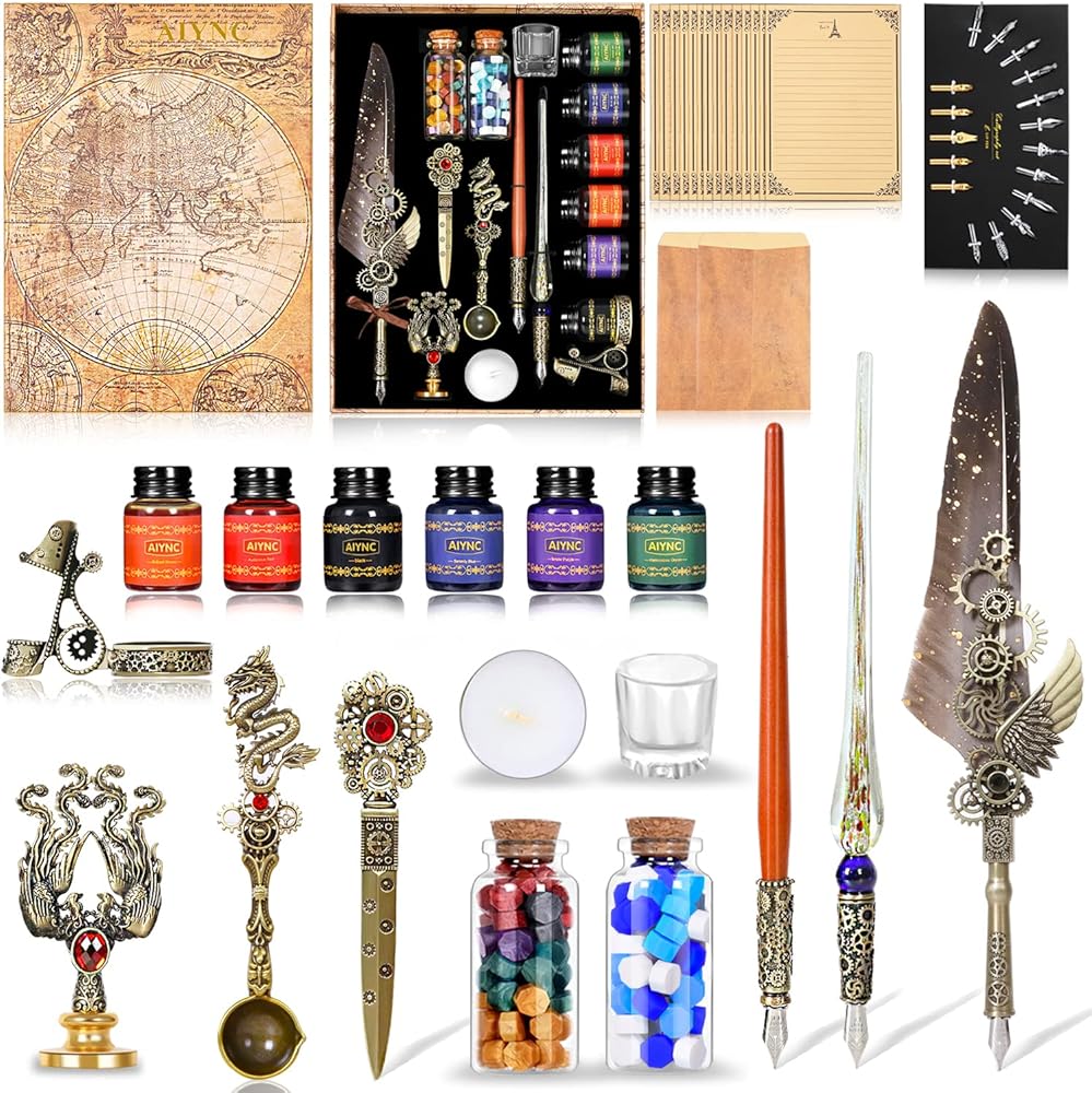 【QUILL PEN INK SET INCLUDED】: 1 Quill Pen, 1 Glass Dip Pen, 1 Wooden Dip Pen, 6 Bottled Ink (6 Colors: Black, Red, Orange, Purple, Blue, Green), 16 Letter Paper, 2 Envelope, 17 Stainless Steel Nibs of Different Sizes, 1 Engraving Pen Holder (Can hold ink and dip pens),1 Ink Cup, 2 Bottles of Fire Paint Wax Beads, 1 Seal Stamp(gear clock )pattern, 1White Wax, 1 Wax Melting Spoon, 1 Open Envelope Tool, 1 Exquisite Retro High-End Map Gift Box.