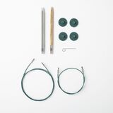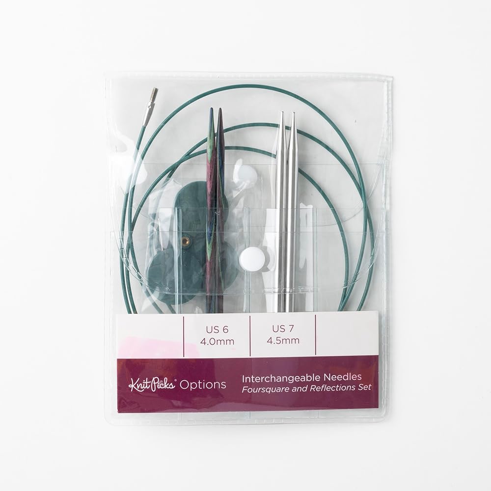 INCLUDED: One pair of US size 6 (4mm) Caspian wood interchangeable tips, one pair of US size 7 (4.5mm) Nickel Plated metal interchangeable tips, one 24" cable, one 40" cable, four end caps, and one cable tightening key