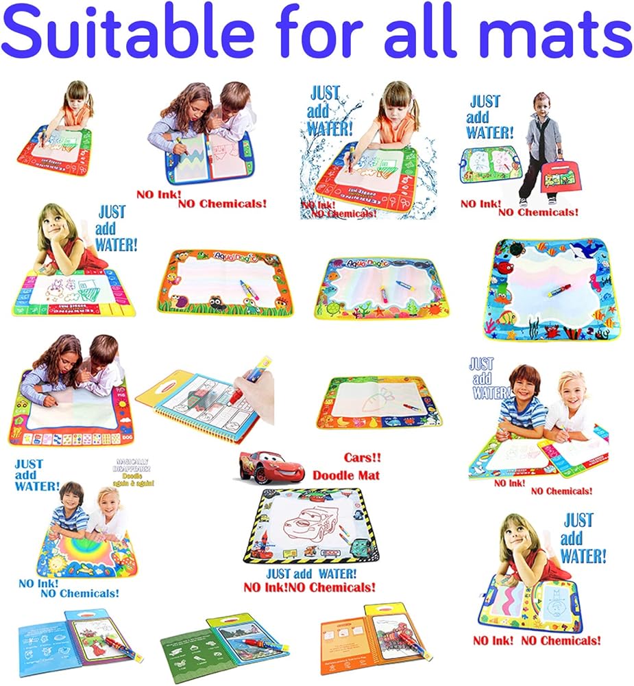 Package Contents: high-quality doodle pens and brushes, designed as no-leak replacements for Aqua Doodle Mats. Large pens for big drawings, small ones for letters and numbers, and brushes for fine details and finishing touches.