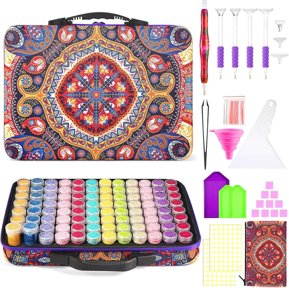 You Will Get: 1 storage container, 60 diamond storage bottles, 1 resin drill pen, 2 sticker papers, 1 large tray, 2 small trays, 1 funnel, 4 drill pens, 10 purple clay, 4 diamond pen grip glue, 1 correction tool, 30 OPP bags, 1 plastic tweezer, 5 Beads tips a total of 123 diamond painting tools.