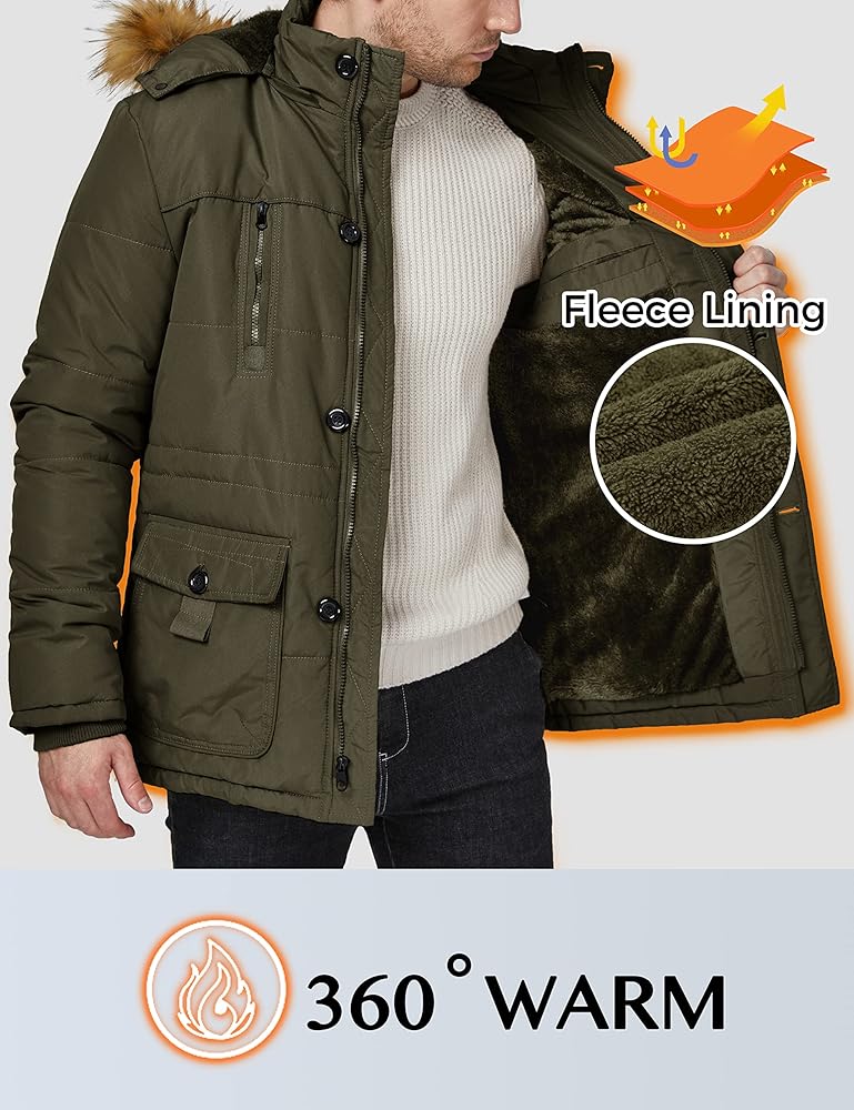 Tailored to your preference - You can style this mens parka however you want! It has an adjustable and detachable zippered hood as well as a removable faux fur trim if you prefer a simpler look.