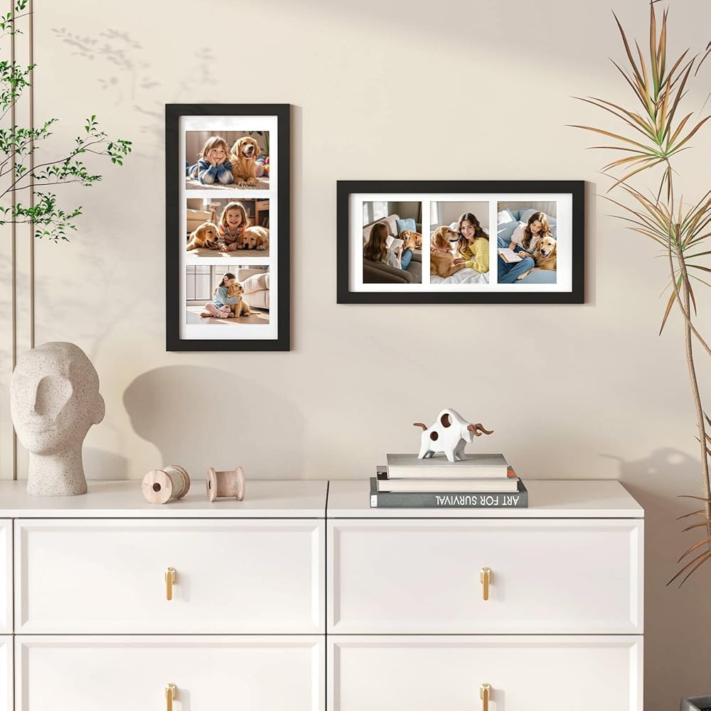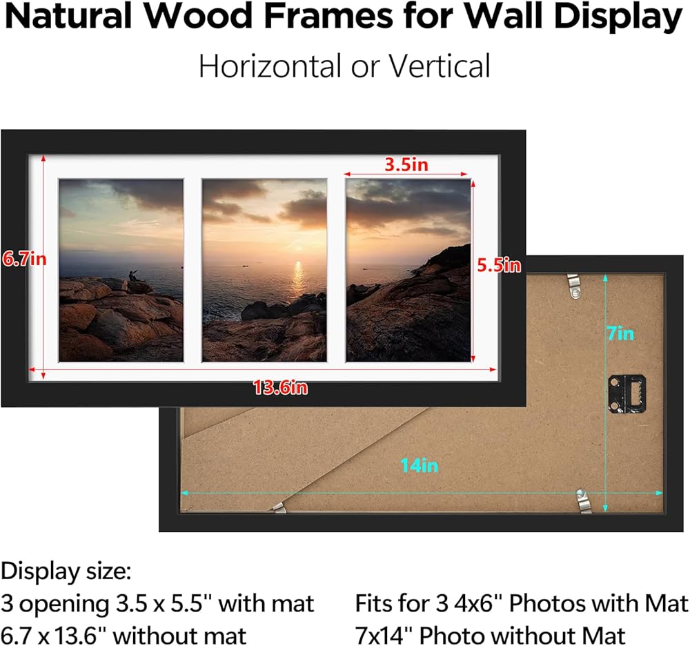 KINLINK 7x14 Picture Frames Black, Solid Wood 3 Opening Collage Frames with Acrylic Plexiglass for Multiple Three 4x6 Photos with Mat or 7x14 without Mat, Wall Display Photo Frames, Set of 2