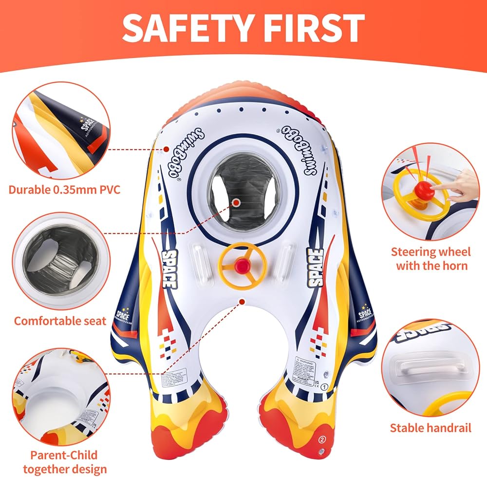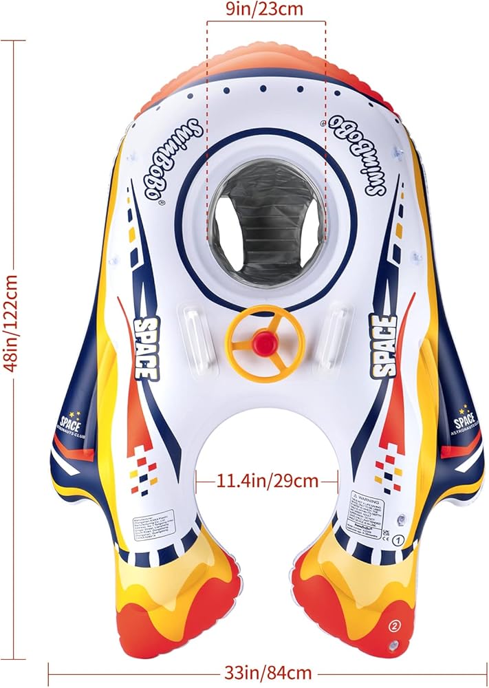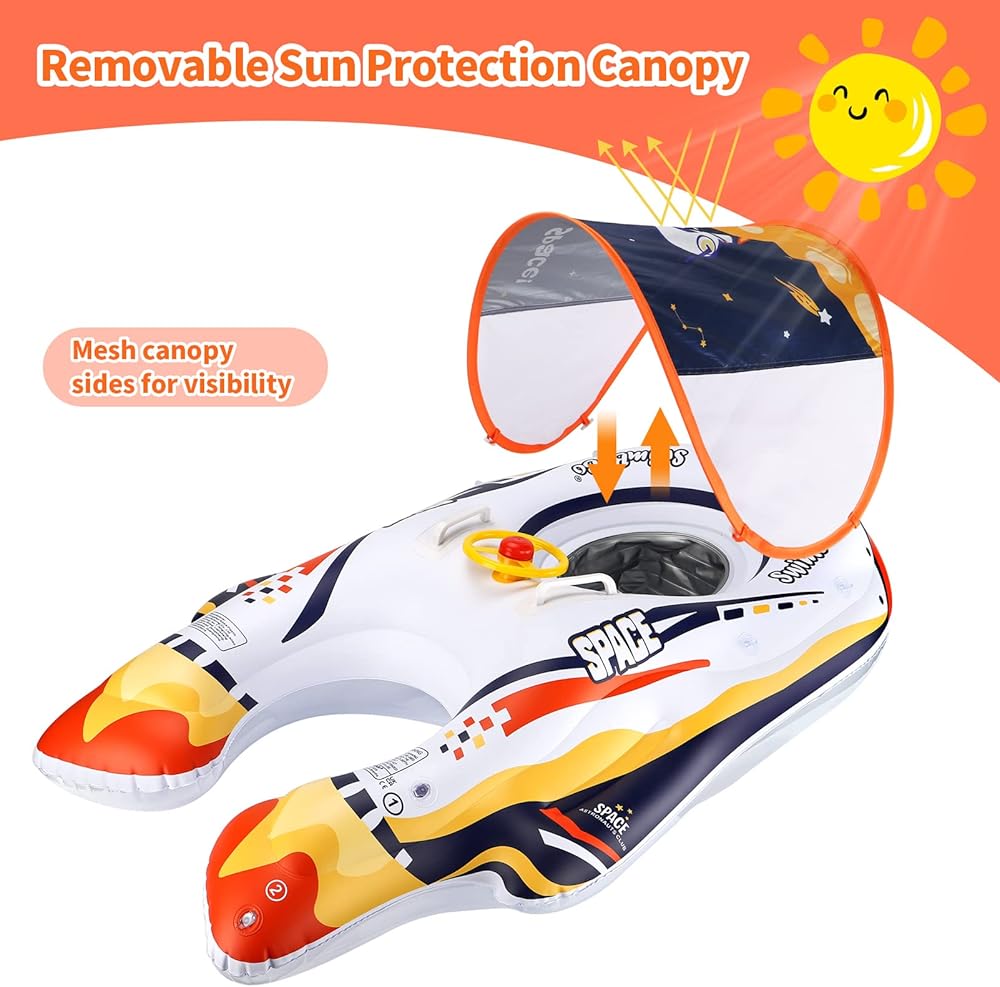 Gorgeous design--The sunshade canopy of baby pool float is removable for protecting your baby from sunshine. Safe back holder and security handles will keep them supported and balanced for more security. Baby will enjoy this float with the steering wheel and the horn. Comfortable seat with two enough size leg hole for baby to sit easier.