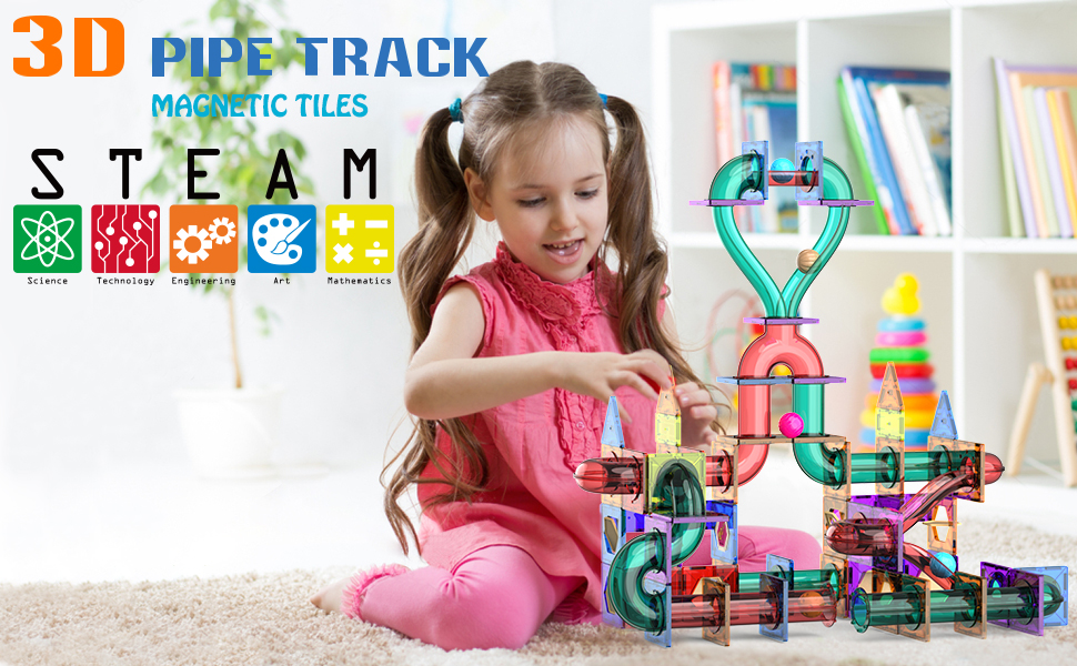 【Unique and Fun Design】: Unlike single magnetic tiles play,this marble run set makes magnetic tiles playing experience more funny and creative.Also,the magnetic strength of magnetic tiles is very strong ,so the magnetic tiles race track is very easy to assemble and take apart .Esspecially, the translucent pipes can be left open so that kids can see the marbles move from the top of the set to the bottom,a definitely exciting experience!