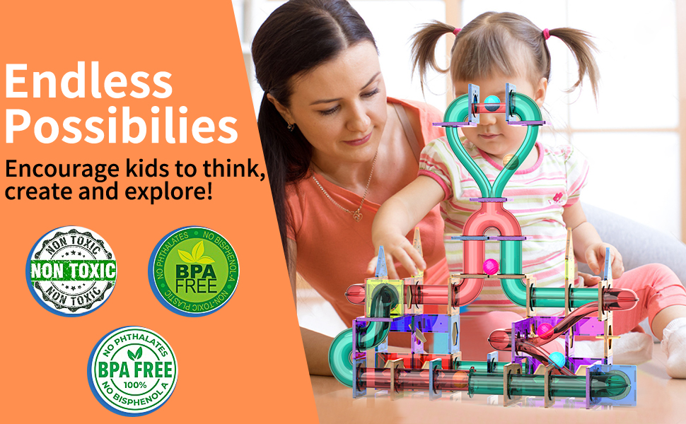 【High Quality Material and Safety】:This magnetic tiles marble run is made of Non-Toxic and durable plastic material,ensuring safety of this toy.More,the round edge and silky smooth surface design can effectively avoid hurting the little hand.