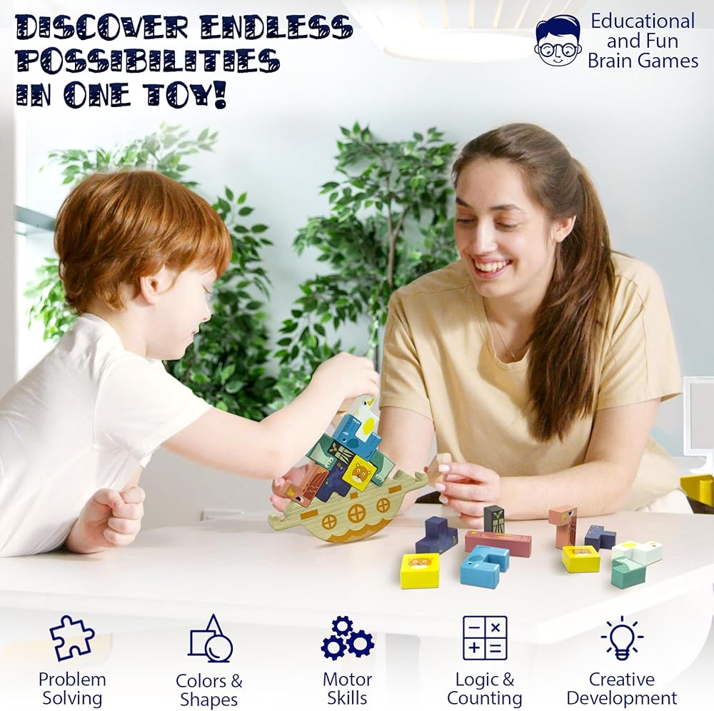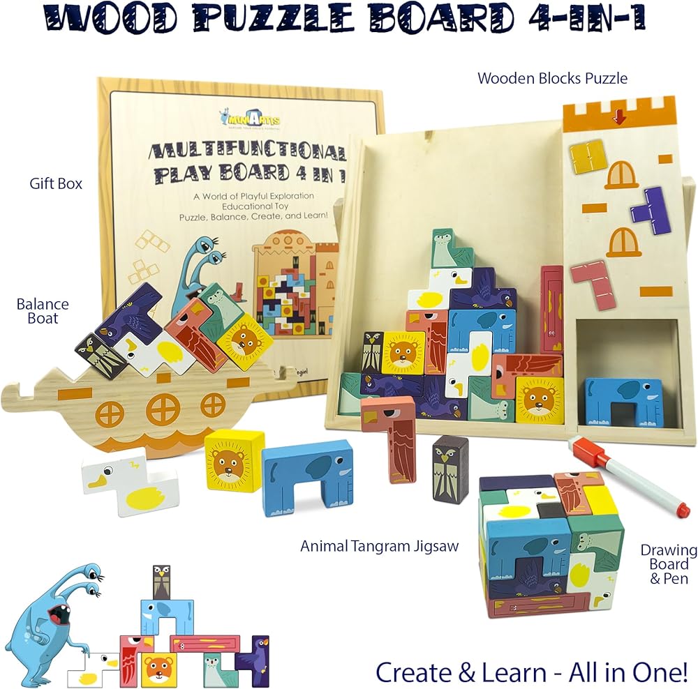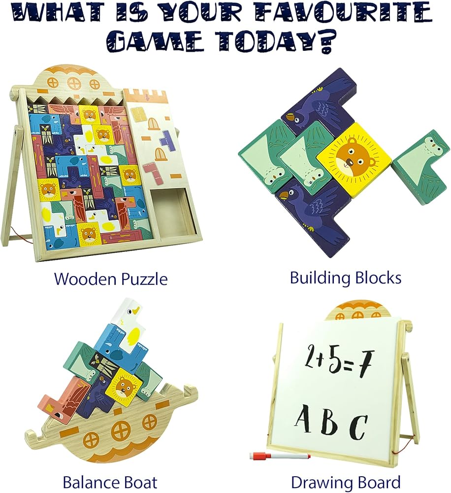 ENGAGING BRAIN TEASERS & MULTIFUNCTIONAL PLAY: Elevate playtime with the ultimate 4 in 1 wooden blocks puzzle brain teasers a STEM Montessori educational gift that offers versatile and vibrant engagement. This unique set includes animal wooden puzzle blocks, a wooden stacking balance, and a kid's easel drawing board—perfect for family games, parties, and travel. Ideal for both kids and adults, this wooden toy is a team-building tool that fosters creativity and critical thinking.