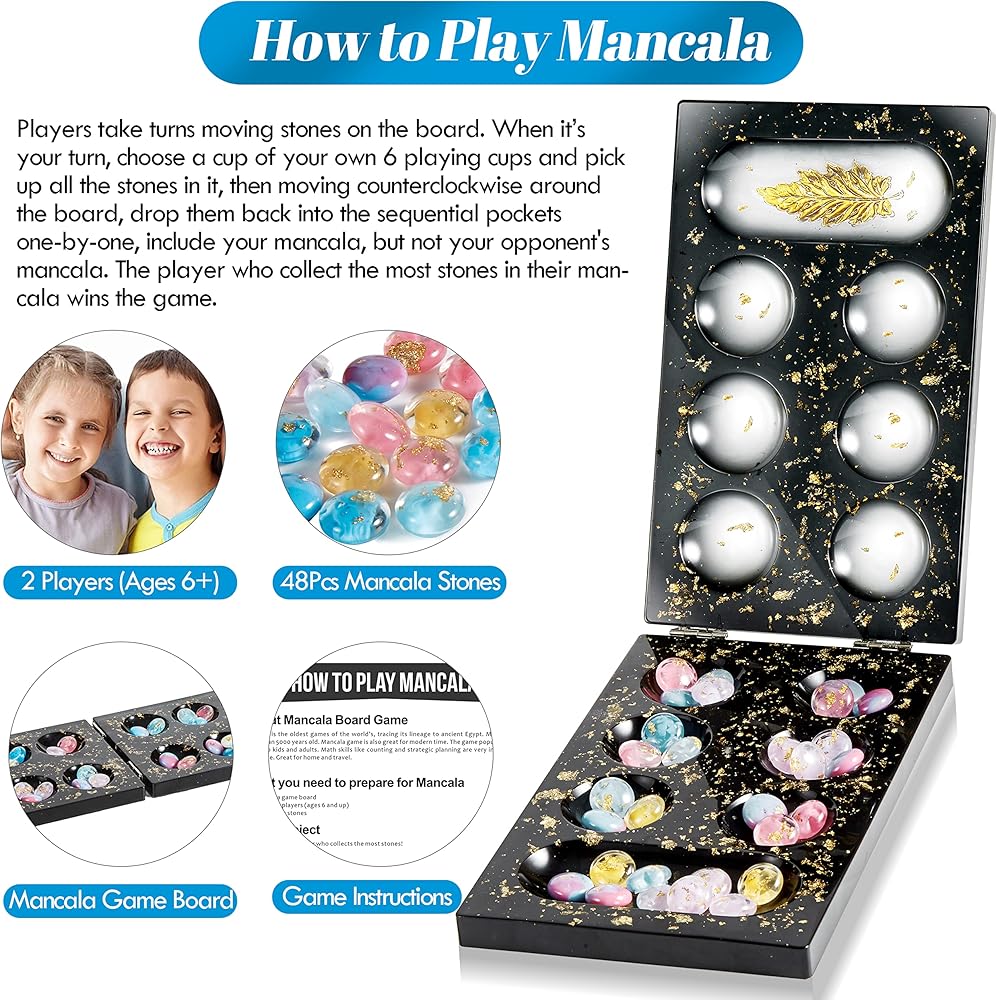 【Classic, Educational and Timeless Game】- Mancala is the oldest games of the world's, tracing its lineage to ancient Egypt. Mancala have more than 5000 years old. Mancala game is also great for modern time. The game popular for kids and adults. Math skills like counting and strategic planning are very important to this game. It's the perfect fit for family game nights, traveling, sleepovers, gatherings, parties, and any occasion that calls for an engaging and fun game.