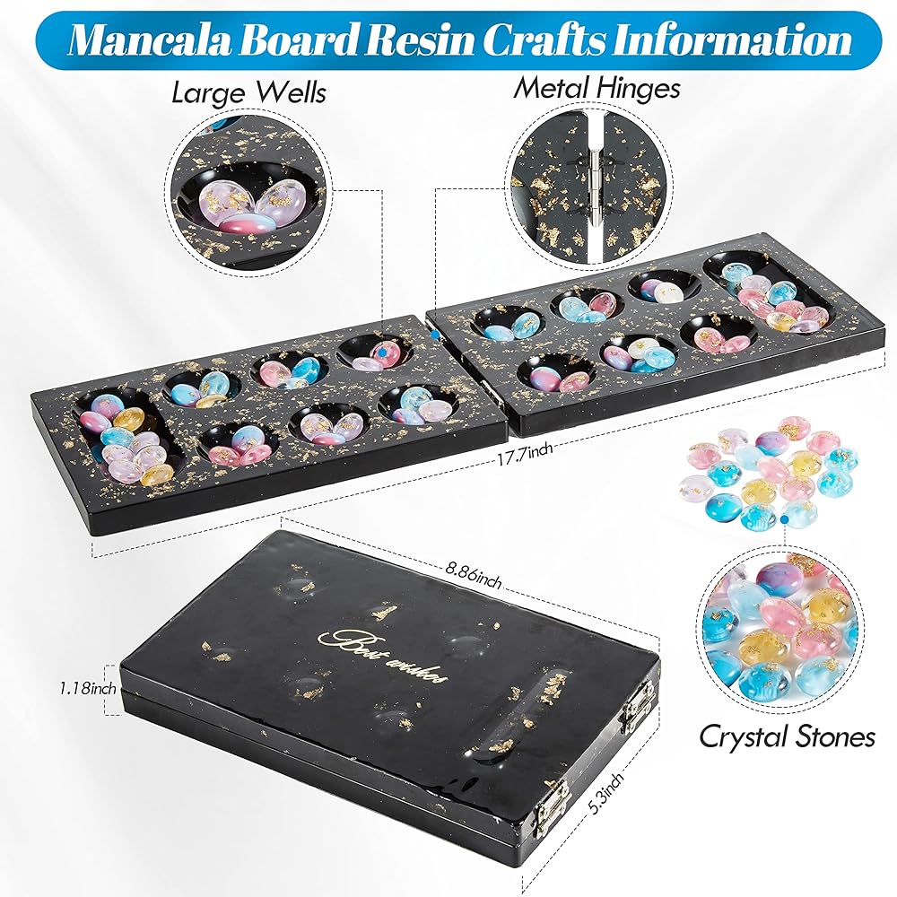 【Mancala Board Game Resin Molds Set】- Package include mancala board silicone molds x 2, mancala stones resin mold x 1, metal hinge x 8, screws x 32, mancala game instructions x 1. The mancala stones resin mold can make 24pcs crystal epoxy resin mancala stones one time, allowing you to get the perfect mancala stones and a full set of 48pcs can be completed in just two times. The mancala board games suitable for kids and adults, as well as occasions including parties, game night and festivals.