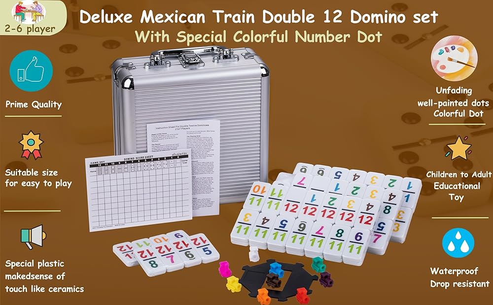 【EASY TO CARRY 】The portable aluminum case is easy to carry and convenient for dominoes storage. It always comes in handy during travel or camping. Also the aluminum case can protect Mexican train dominoes from damage.