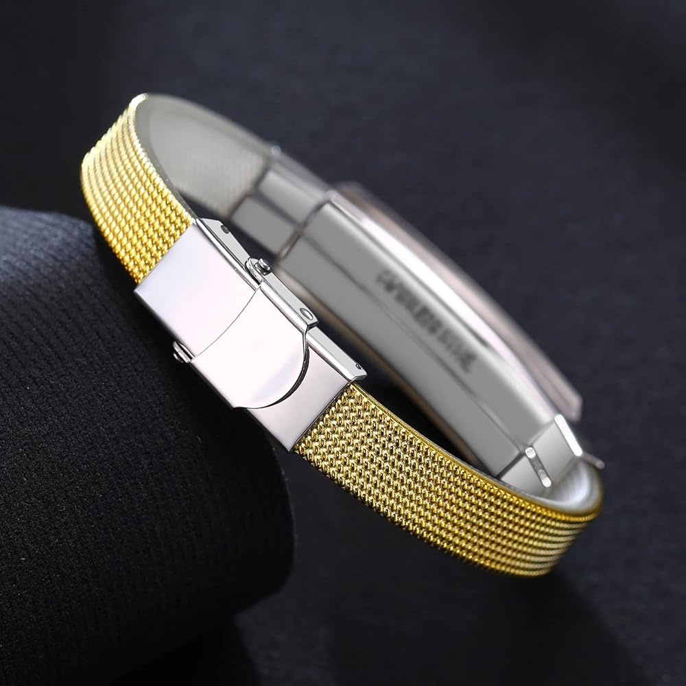 MZZJ Free Engraved Drug Food Allergy Name DOB Emergency Contact Message Medical Alert ID SOS Bracelet Two-tone Stainless Steel Mesh Bracelet Cuff Bangle Wristband for Adult Teens,8.07"