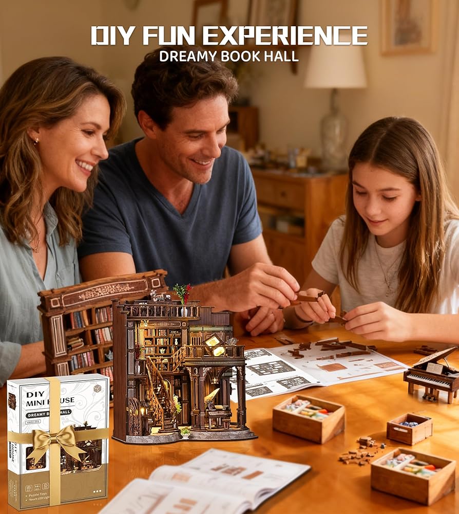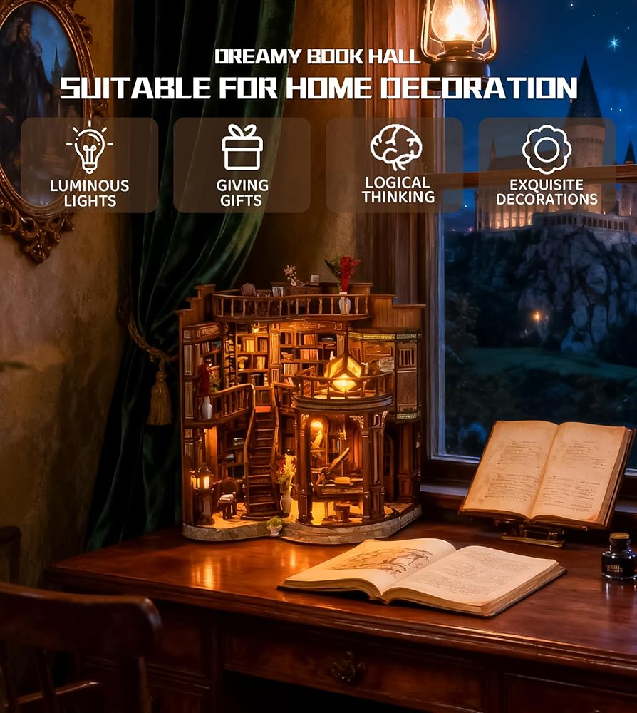 Roroom DIY Miniature House Kit, Dreamy Book Hall Book Nook with LED Light, 3D Wooden Puzzle Miniature Dollhouse Kit for Bookshelf Decor-Creative Gift for Teens&Book Lovers