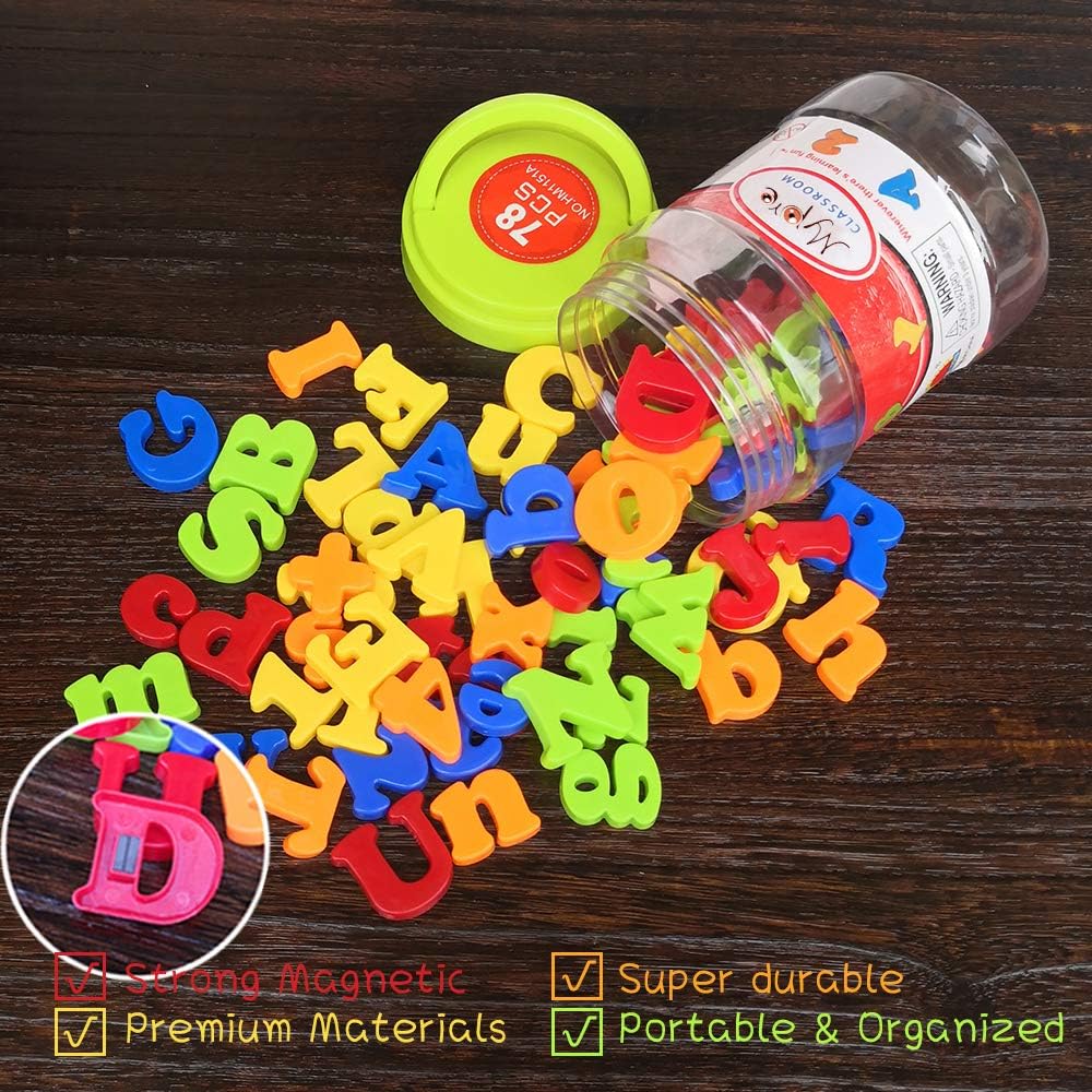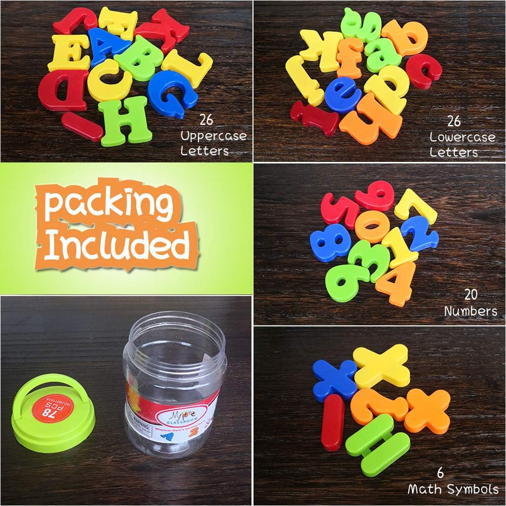 【78 Pcs of Magnet Alphabet and Numbers】 Complete components includes 26 uppercase letters ( A-Z), 26 lowercase magnetic letters (a-z), 20 Numbers and 6 math Symbols (+-× ÷=?), each letters numbers sizes about 1in -1.2in. Fridge magnets for toddlers contain five different colors ( green, blue, orange, red, and yellow). Mypre magnetic letters and numbers comes in a plastic cans with sturdy handle and featuring snap shut cover, convenient to store and carry.