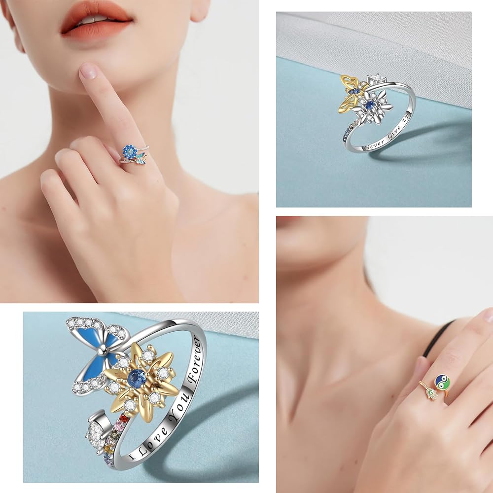 The spinner anxiety ring for women is made of 925 sterling silver and AAA+ cubic zircon. The wrap-around open ring can be flexibly adjusted in size to fit most fingers. This material can largely prevent the wearer from itching and allergies, is comfortable for sensitive skins. Zircon is firm and not easy to fall off.