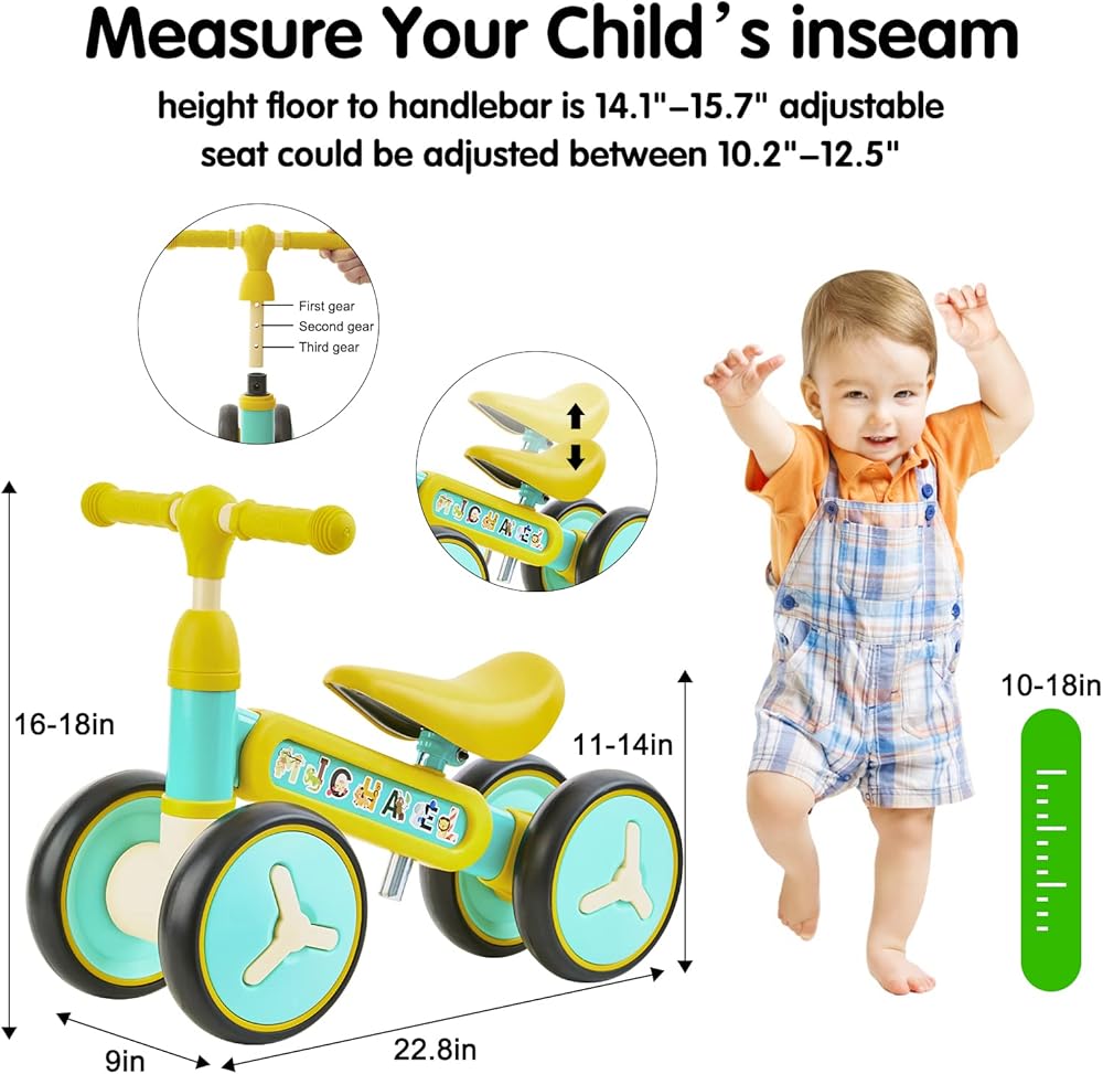 【Adjustable Seat】Our toddler balance bike seat could be adjusted between 10.2"-12.5", height floor to handlebar is 14.1"-15.7" adjustable, Suitable riding heights for children of different sizes and ages, You can adjust the balance bike to the desired height according to baby's need for better maneuver.