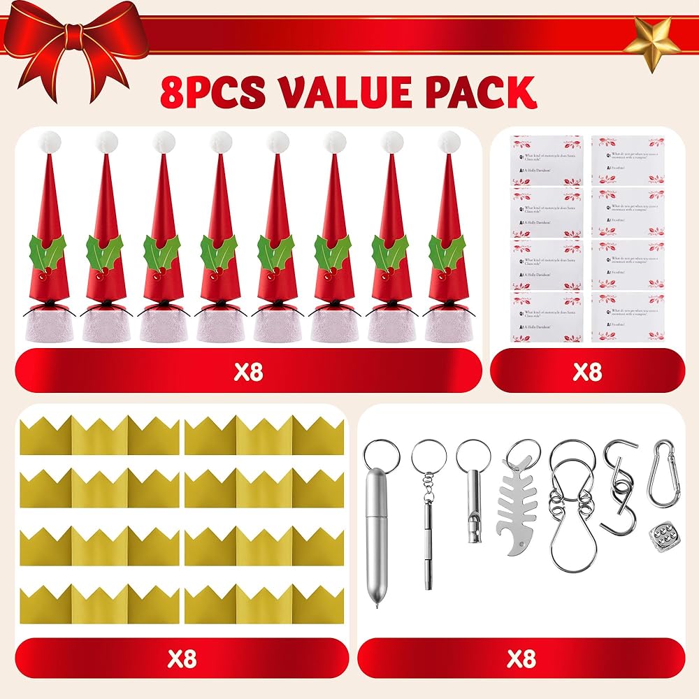 VALUE PACK: Inside our party table favor set, you'll find the gold foil paper crown, 8 Christmas jokes, and 8 different silver little hanging decorations. It's the perfect combination of fun and festive goodies for your Xmas party.