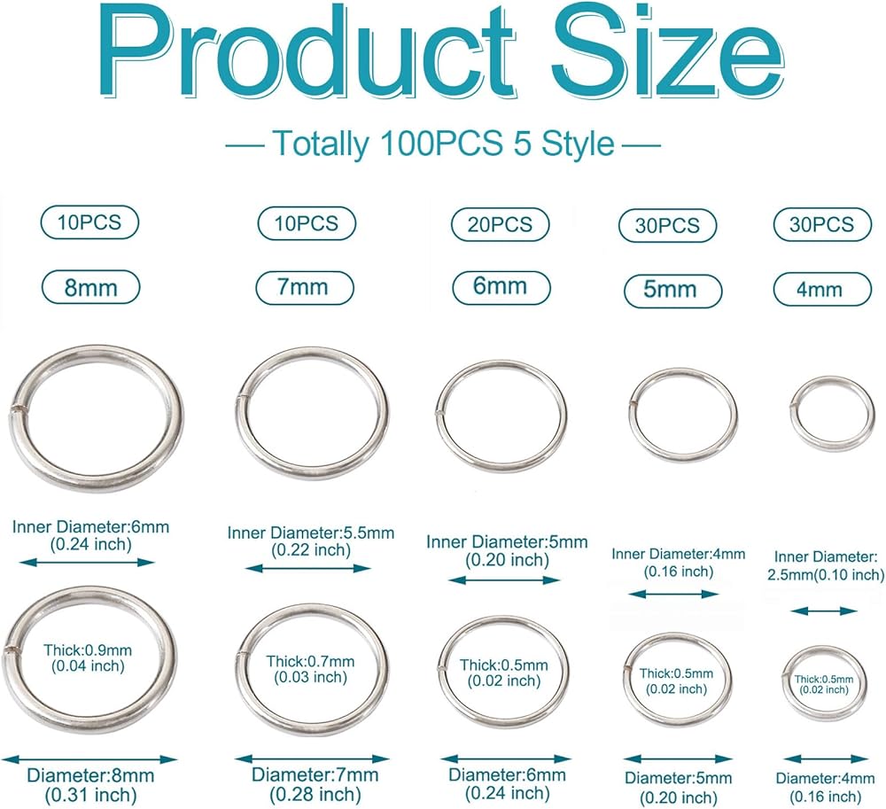 【Assorted Sizes --- 4mm/5mm/6mm/7mm/8mm】: You will get 5 different sizes of sterling silver jump rings. 4mm jump rings: 4x0.5mm, Inner Diameter: 2.5mm, 30pcs. 5mm jump rings: 5x0.5mm, Inner Diameter: 4mm,30pcs. 6mm jump rings: about 6x0.5mm, Inner Diameter: 5mm, 20pcs. 7mm jump rings: about 7x0.7mm, Inner Diameter: 5.5mm,10pcs. 8mm jump rings: 8x0.9mm, Inner Diameter: 6mm, 10pcs.