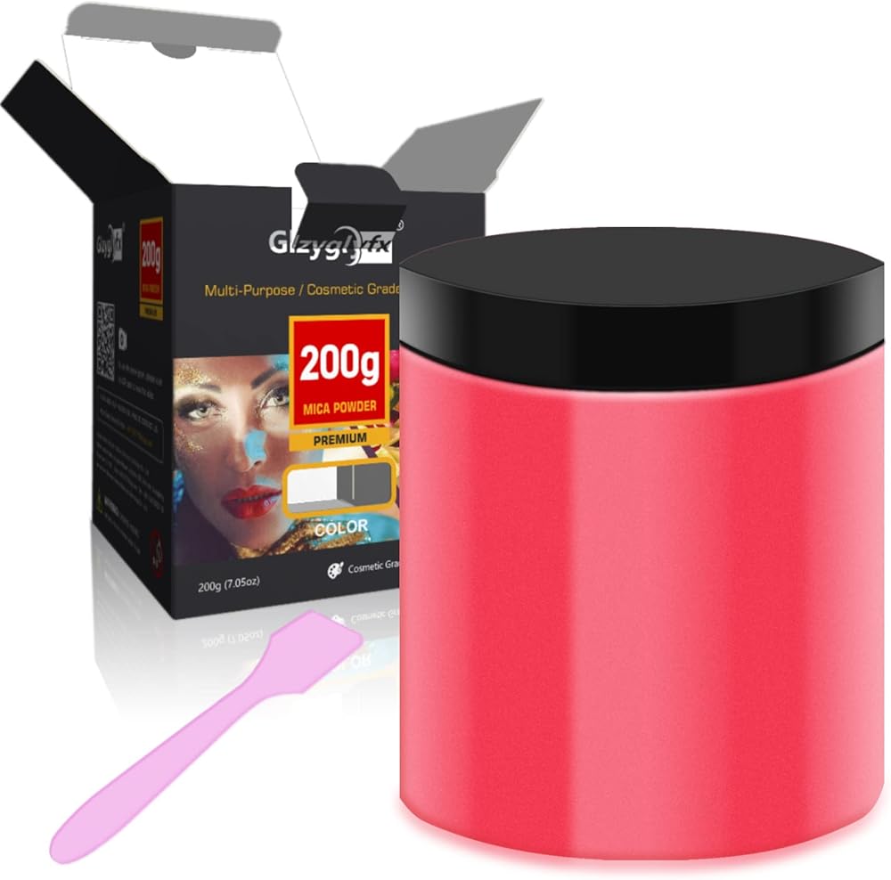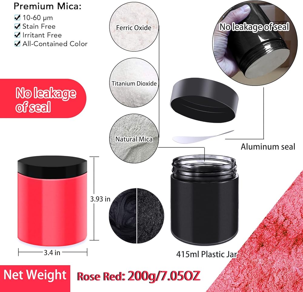 The amount or volume of Purple mica pigment powder filled in each jar will appear to be different for each pigment color due to the differences in particle size and density between pigments. Each jar of mica powder weighs >200 grams!