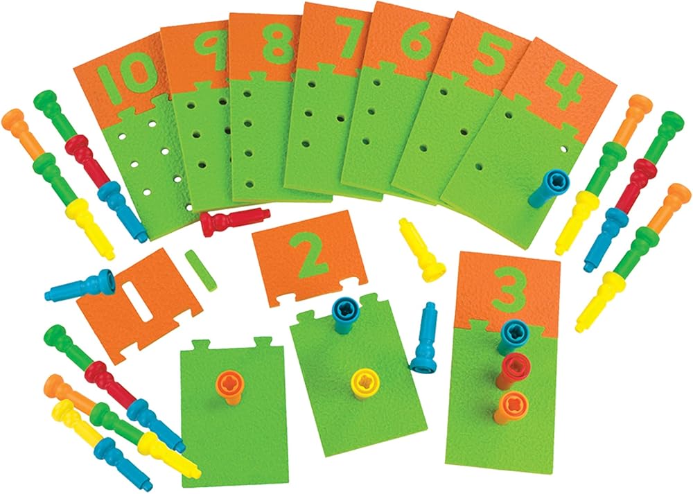 Kids learn early math skills when they play with Number Puzzle Boards & Pegs. This teaching tool provides progressive challenges as kids advance. Each number puzzle connects only to the puzzle board with the correct number of holes. Use the self-correcting puzzles alone, or combine them with the stacking pegs to practice counting and learn basic adding and subtracting. Kids also will have fun seeing how high they can stack the pegs.