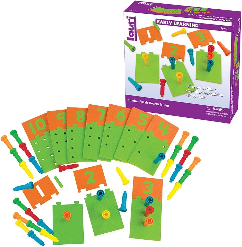 Kids learn early math skills when they play with Number Puzzle Boards and Pegs. This teaching tool provides progressive challenges as kids advance. Each number puzzle connects only to the puzzle board with the correct number of holes. Use the self-correcting puzzles alone, or combine them with the stacking pegs to practice counting and learn basic adding and subtracting. Kids also will have fun seeing how high they can stack the pegs.