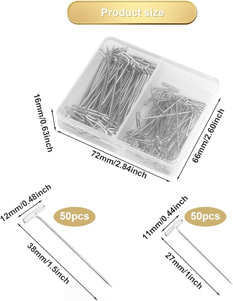 Product Content: You will receive 100pcs wig T-pins and a plastic box to store and carry them, including two sizes 1inch/27mm and 1.5inch/38mm. Sufficient to meet your various needs for using.