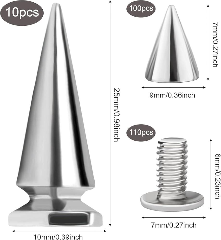 TWO DIFFERENT SIZES: This cone spike set contains 2 different sizes in 10*25mm/0.39*0.98 inch and 9*7mm /0.36*0.27 inch for different needs. You can create a various combination using the small spikes and large rivets together.