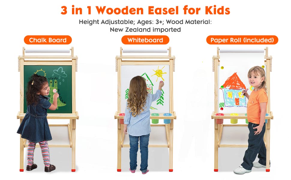 3 in 1 Art Easel: This drawing easel one side is chalkboard, and the other side is magnetic whiteboard, it can also be used together with top paper rolls. The whiteboard allows your child to creative with a marker and magnetic letters. Kids can colored in blackboard with dust-free chalk. Please Note: Clean the blackboard with damp cloth.