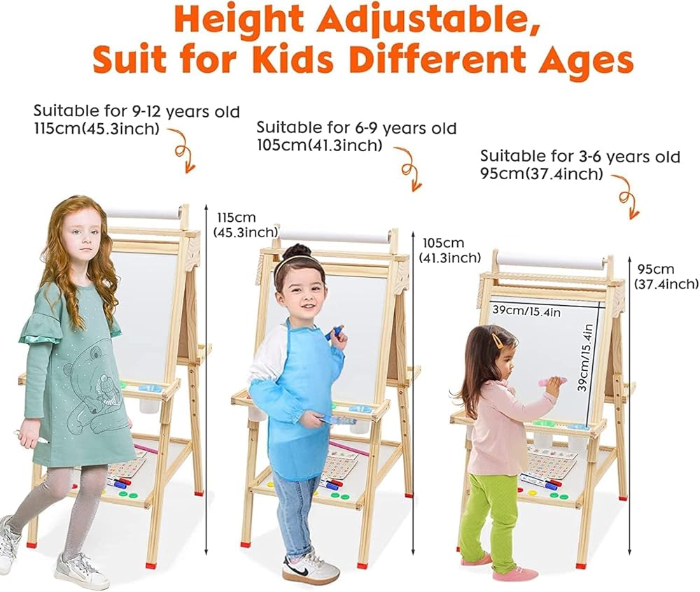 Adjustable Height Ranged 3 Levels: The height of the art easel can be adjusted from 37.4 inches to 45.3 inches to suitable different kids height. making it suitable for children of different ages. As a great learning and expression tool, the easel is the perfect gift for children aged 3 and above