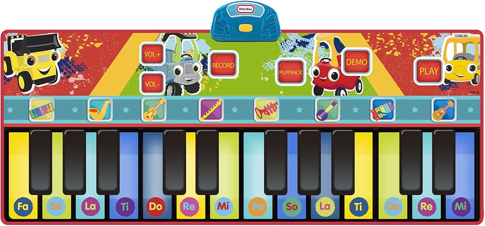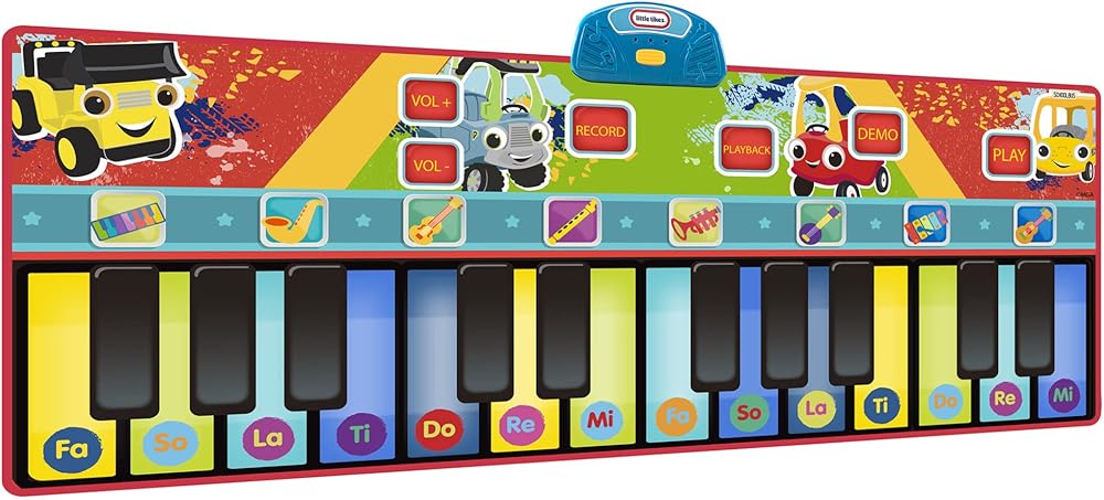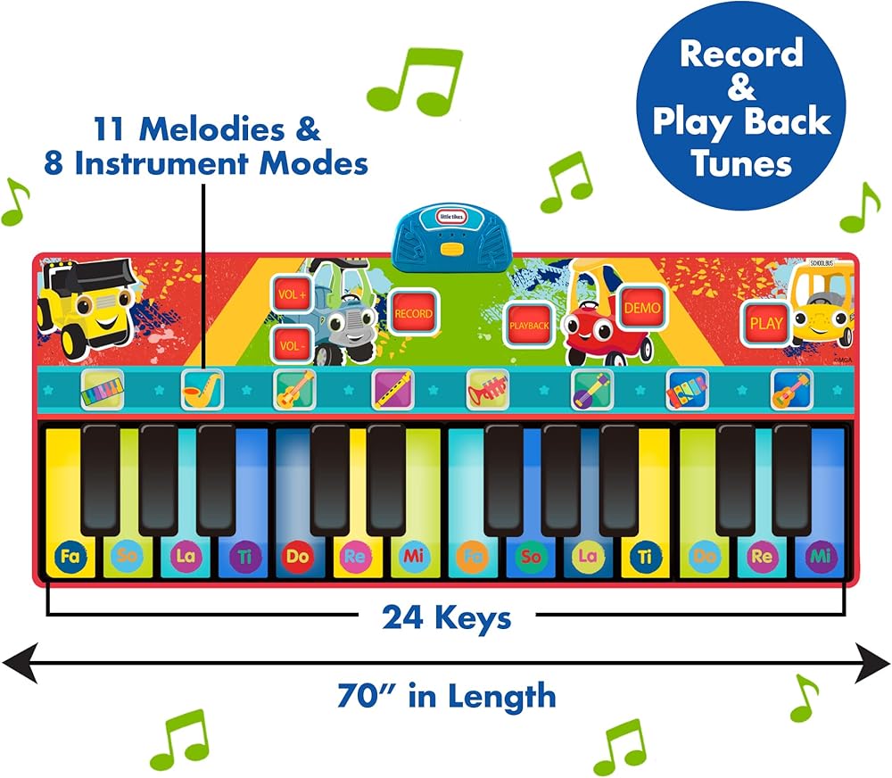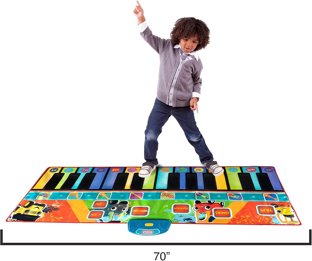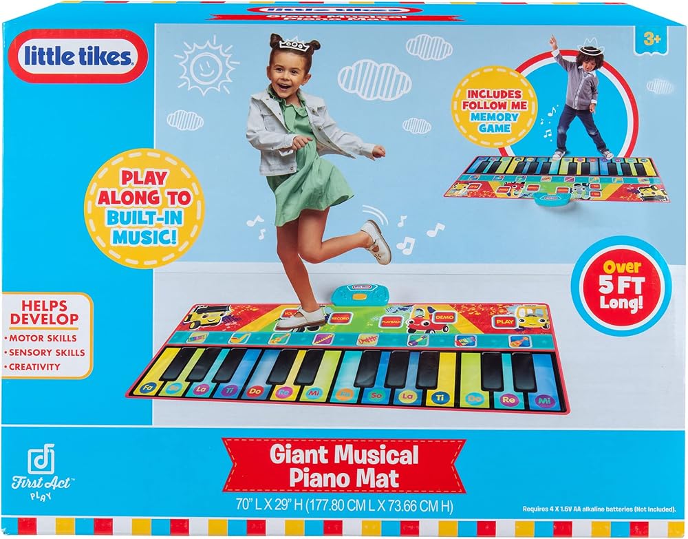 Encourage your little musician's creativity with the First Act Little Tikes Giant Musical Piano Mat! The First Act Piano Mat is giant at over 5ft long! With its giant size, your child can play along with a friend and create their very own melodies and music together! The Piano Mat has 11 melodies and 8 instrument modes, including the piano, guitar, saxophone, violin, banjo, clarinet, trumpet, and xylophone! It also has 24 keys and a record and playback button, and more for an authentic musical experience! This fun instrument for young musicians can help develop necessary skills like hand-eye coordination, fine motor skills, and gross motor skills! Watch them create and play music with the First Act Little Tikes Giant Musical Piano Mat! NOTE: Adult supervision suggested when playing with the First Act Little Tikes Giant Musical Piano Mat. Always play while wearing high traction footwear, such as sneakers or tennis shoes. Do not play barefoot or in socks.