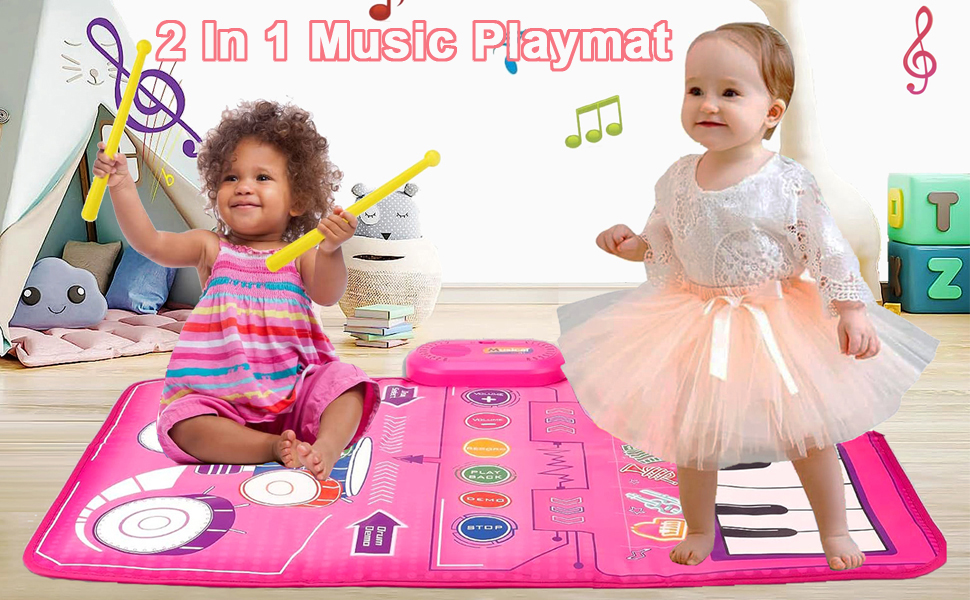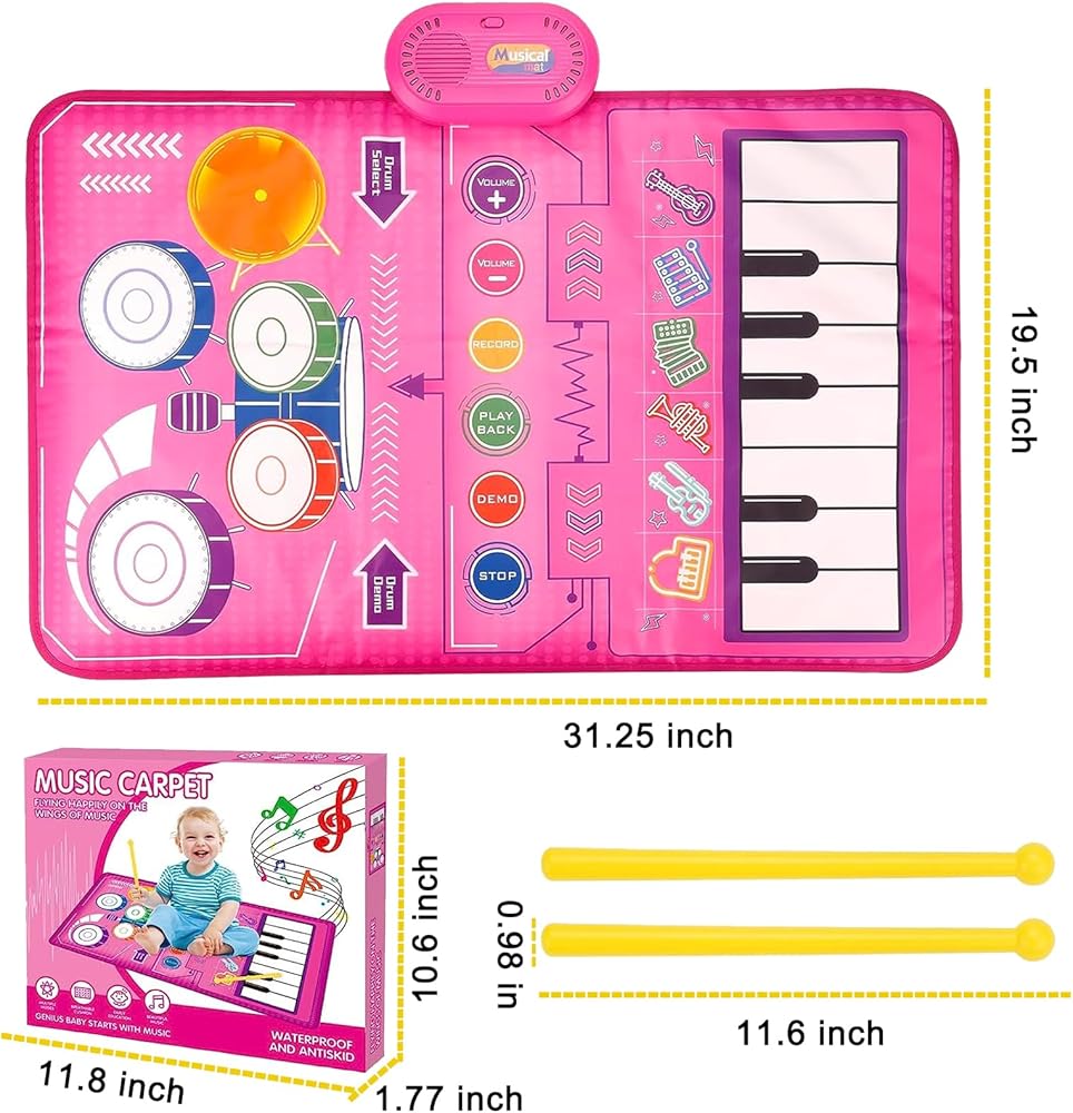 Multifunctional Musical Mat: The 2 in 1 musical mat toy for 1 year old girl and boy has 6 types of instruments (piano, violin, electric vibraphone, trumpet, accordion, guitar) on the piano side. The drum side has drum instruments and drum demonstrations, with 2 drumsticks for drumming . Perfect piano keyboard baby girls gifts, toys for 1-2 year old girls .