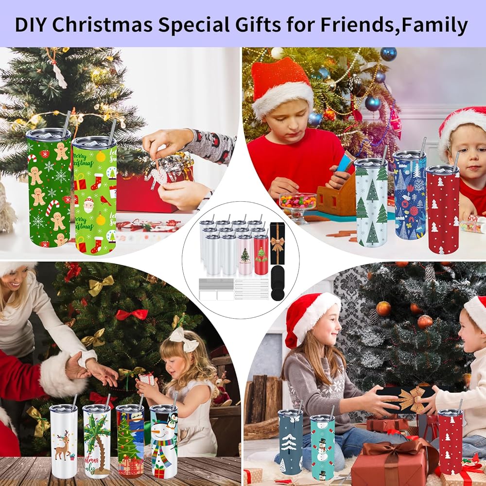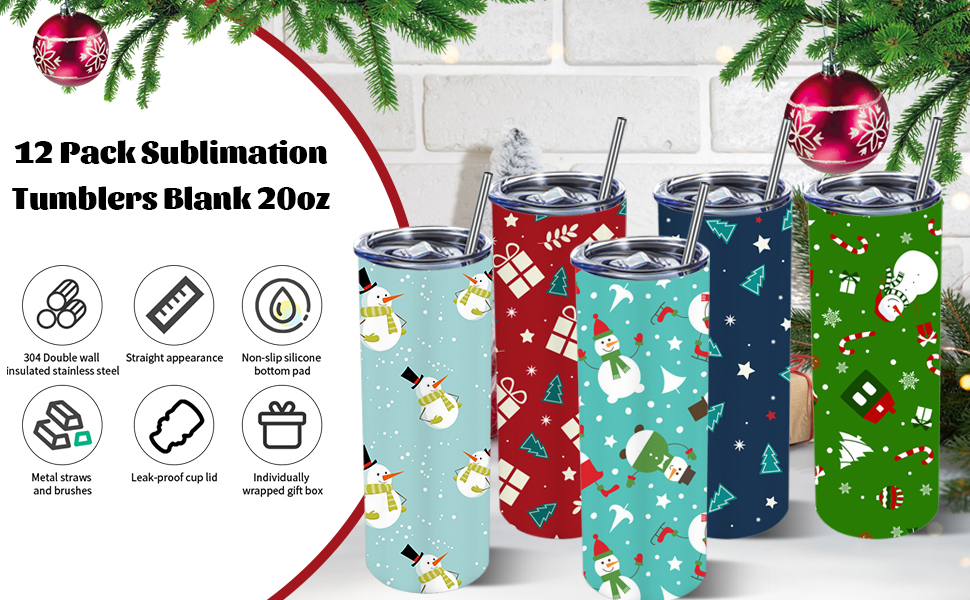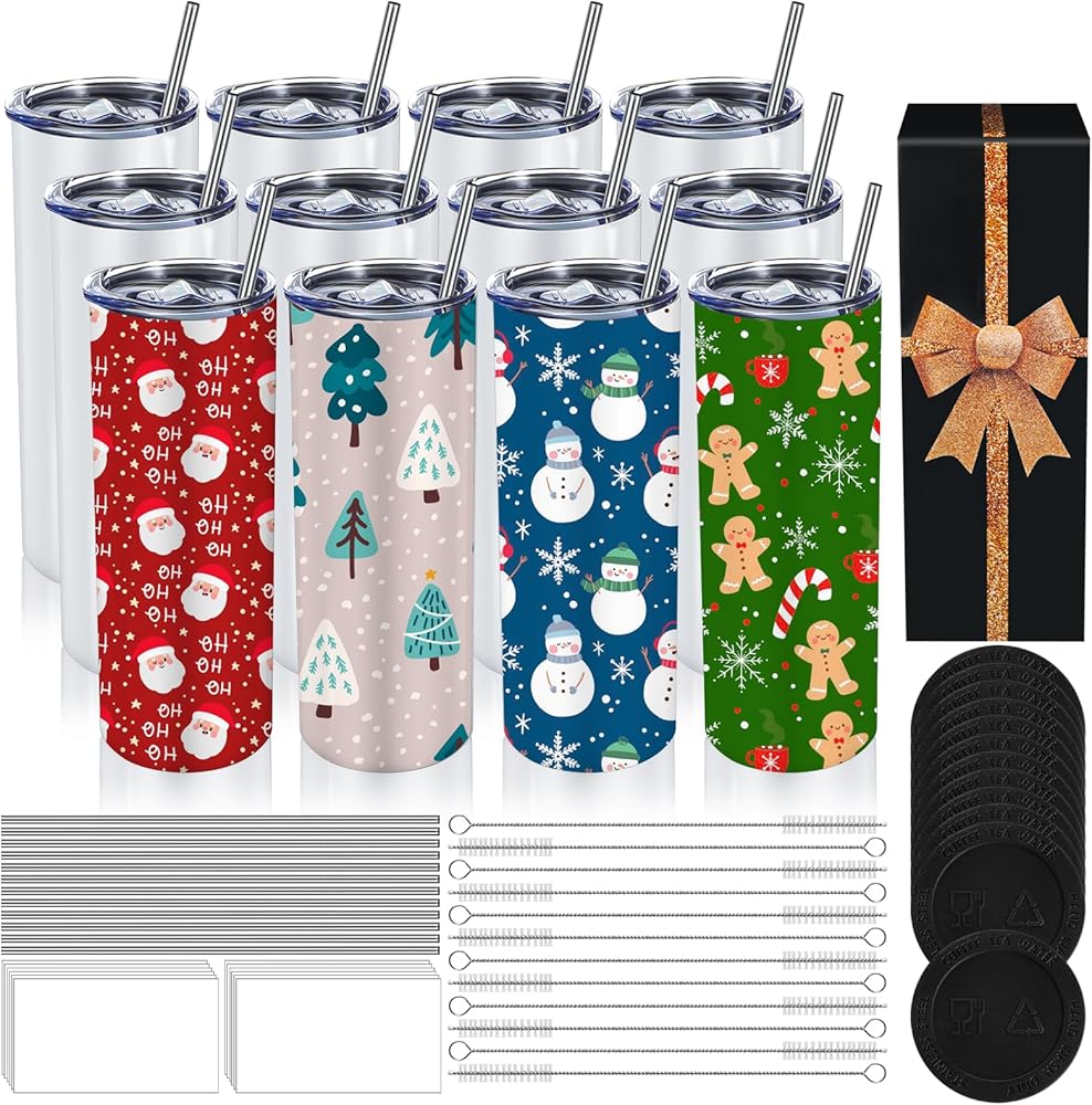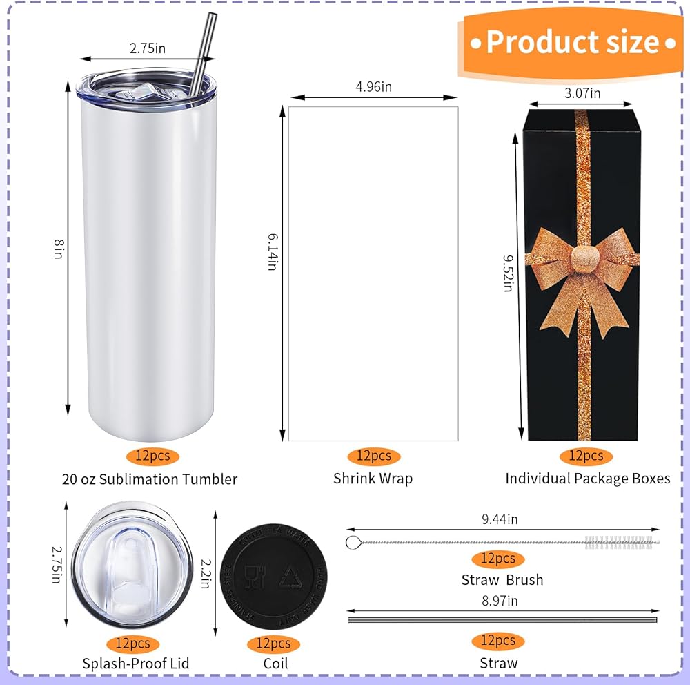 【Independent Gift Box】Each 20oz sublimation tumblers has an independent gift box, which can be DIYed to add any pattern you want. It is very suitable as a customized gift for friends and family. Set includes: 12 pcs 20oz sublimation tumbler blank, 12 splash-proof lids, 12 straws, 12 straw brushes, 12 rubber bases, 12 shrink warp films, and 12 individual gift boxes.