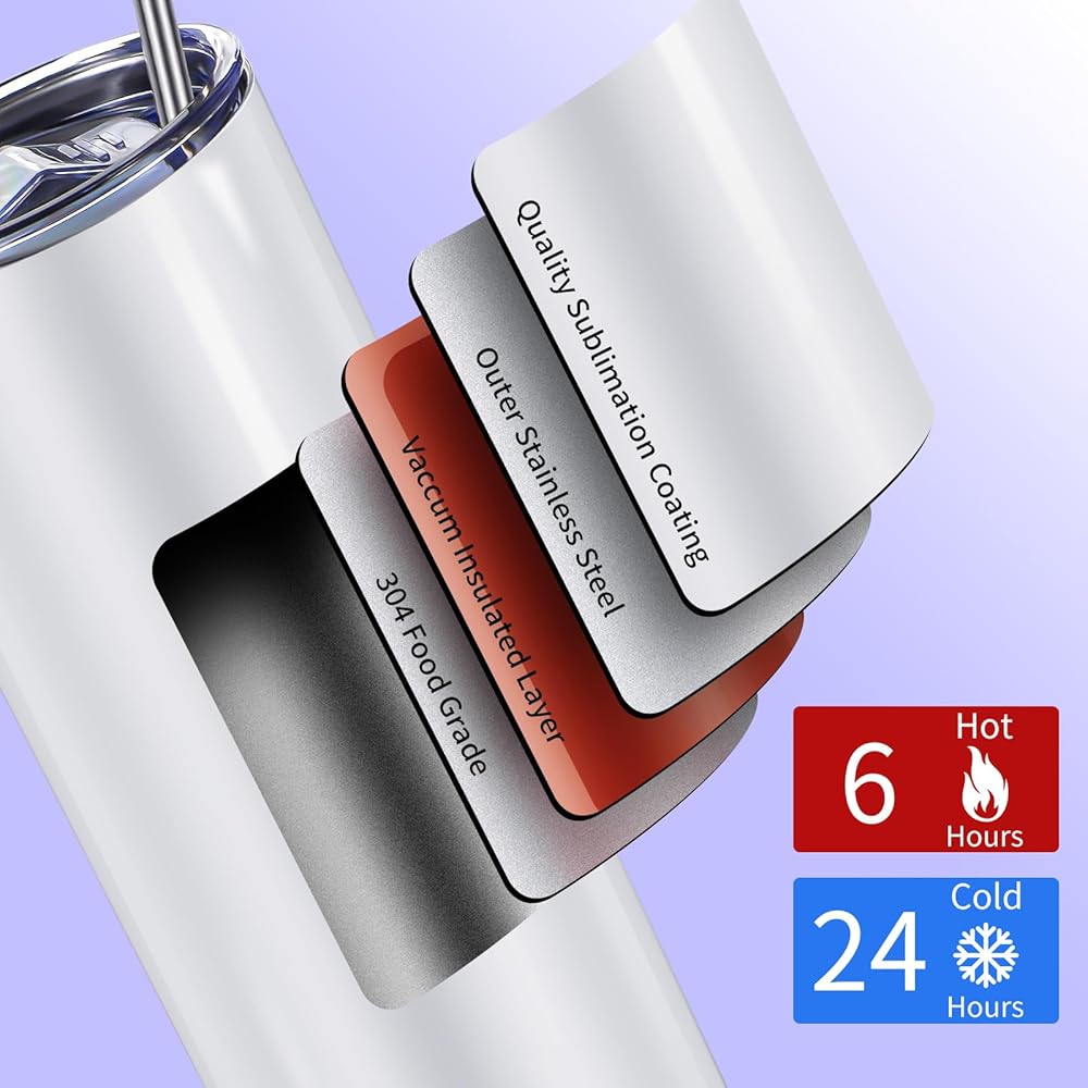 【Material of the Sublimation Tumblers】The straight skinny sublimation cup is made of 304 food-grade stainless steel and uses double-walled insulated walls to keep drinks hot for more than several hours.