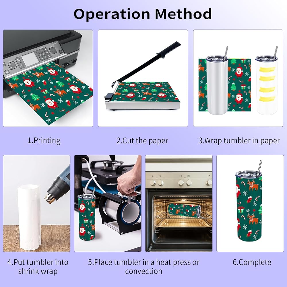 【Operation Steps】 First print out the pattern, use heat-resistant tape to fix the pattern paper on the sublimation tumblers cups, then cover blank outside of 20oz sublimation tumblers with shrink filmm, use a heat press or oven to put the shrink sleeve tightly,and wait It will be completed in about 5 minutes.