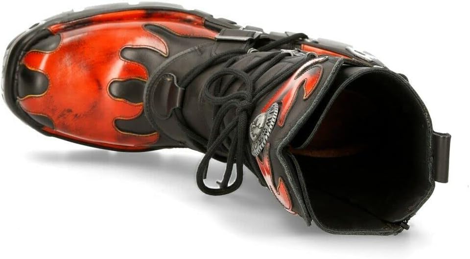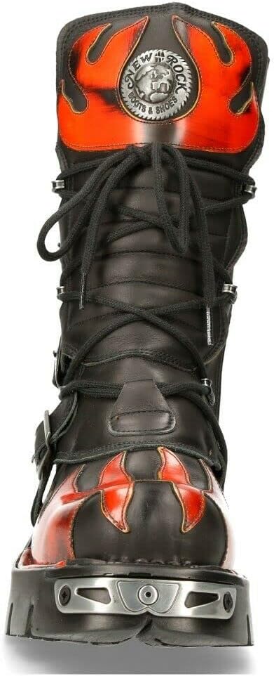 Introducing the New Rock Camouflage 591-S15 Boot. Crafted from high quality leather material the tower boots boasts a classic Military style blended with new punk and rock design cues. This round toe boot is a popular staple for the New rock that features a lace up fastening. The boots features a black colour with brown-green Flame-Decorations in Camouflage-Vintage-Design with Lacing, Zipper, 4 Buckles, New Rock Planet-Logo and black Reactor-Sole with silver Metal-Fittings from the New Rock Reactor Collection. The fit is superb, and the boots provides a cushioned insole