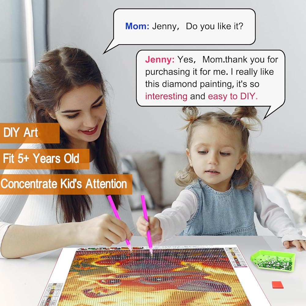【Suitable for All Ages Beginner】Diamond Art is friendly to adults, teenagers, kids, and some beginners. DIY diamond painting can improve hands-on ability, reduce stress, cultivate patience. It also can increase the feelings between you and your family when you finish a diamond painting together.
