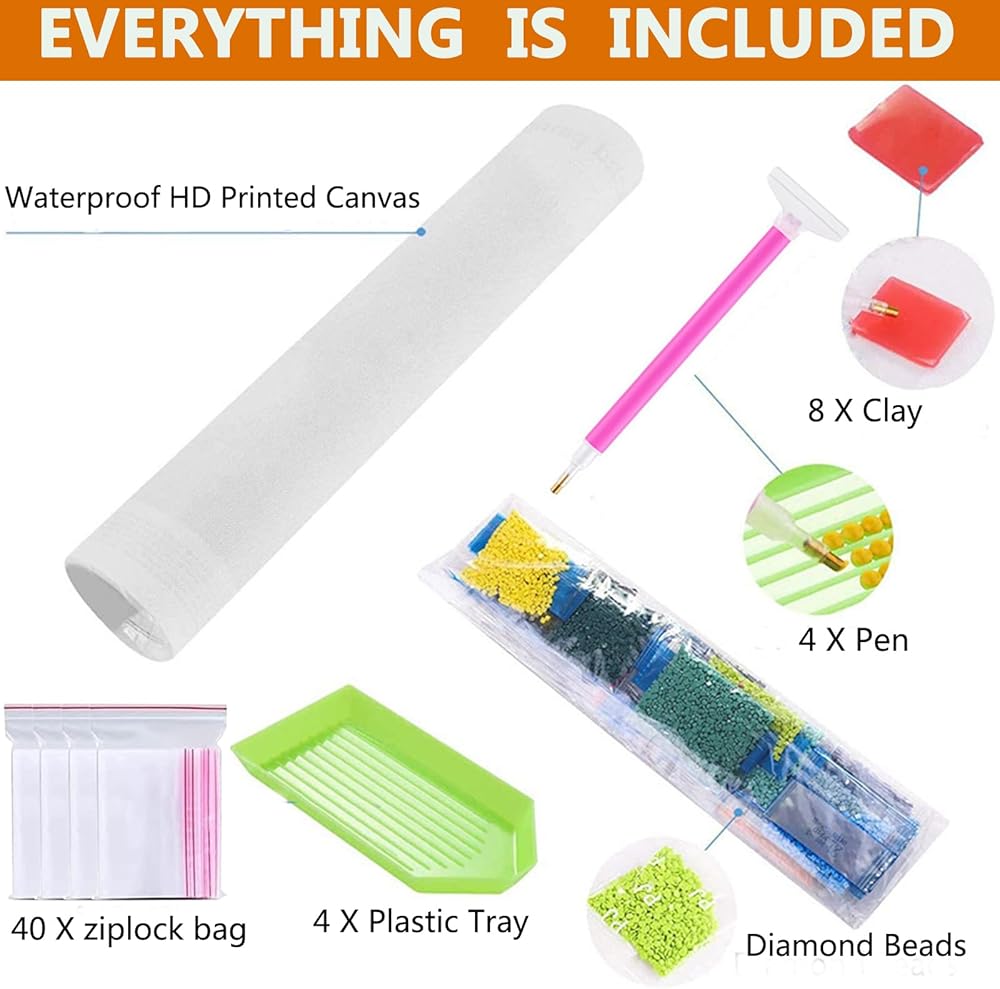 【KITS INCLUDE】 2 x Waterproof HD canvas (12X16 inch/30x40cm), 2 x Sets of Diamond Bags, 2 x Tool Pen ,2 x tray, 4 x Wax, extra 30% more diamonds.Our kits include everything you need,you don't need to buy other accessories.