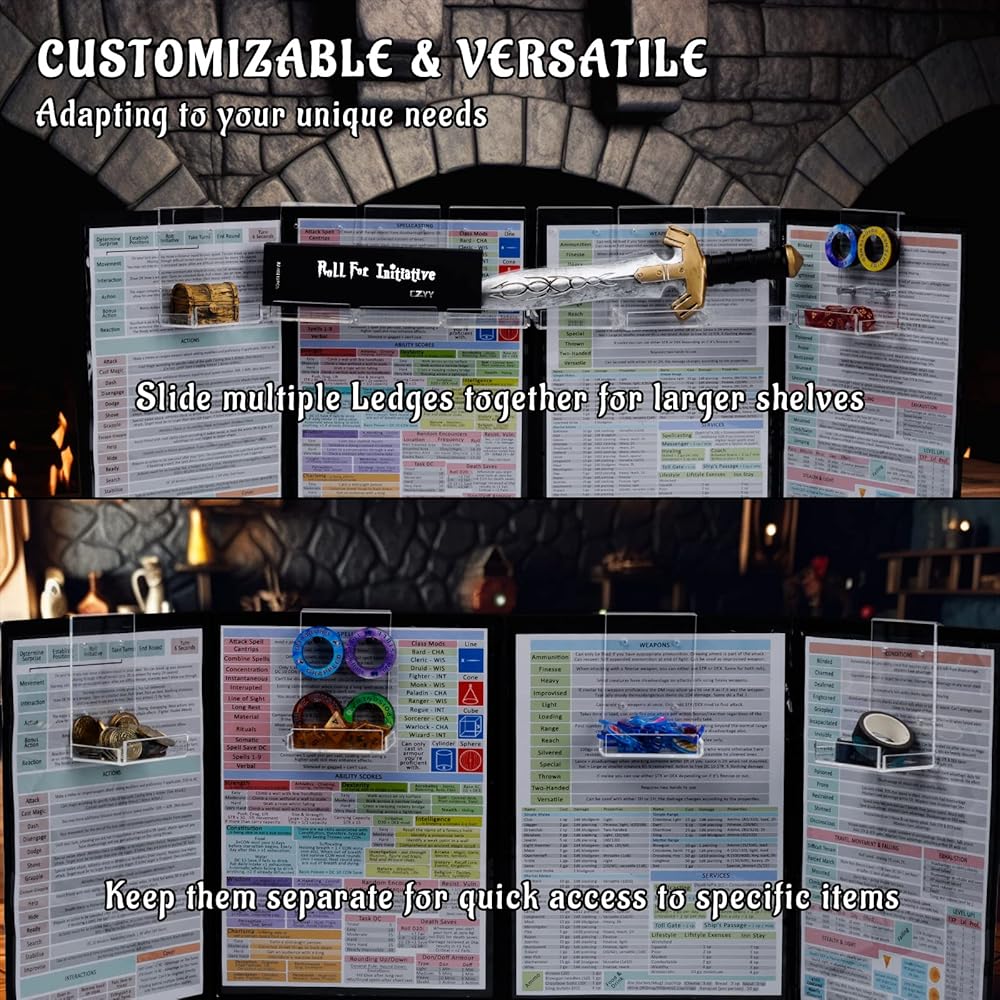 The clear acrylic design ensures that you won't miss any important information printed on your GM screen while keeping everything organized and within reach. The modular design allows you to customize your shelves by sliding them together to create larger ones or keeping them separate for quick access to specific items.