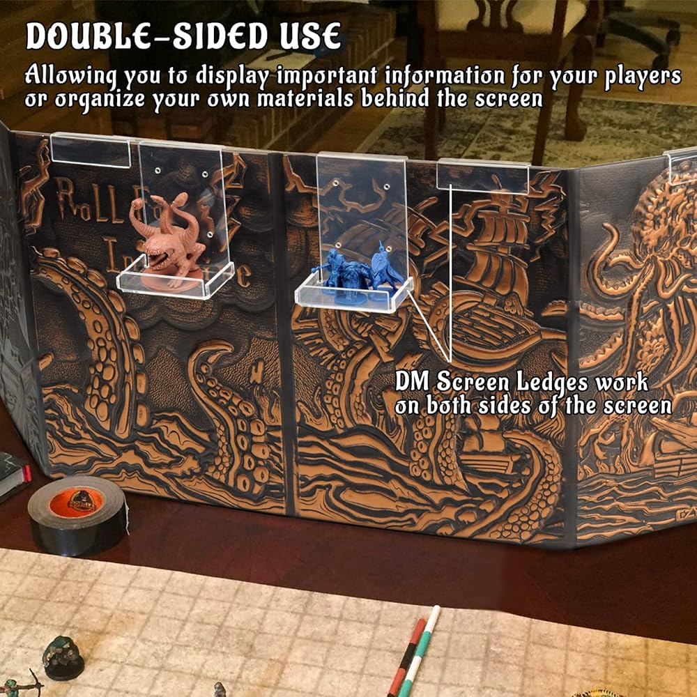 DM Screen Ledges work on both sides of the screen - use them to display important information for your players, or organize your own materials behind the screen. Say goodbye to lost markers and scattered dice, and improve your game with this essential gaming accessory.
