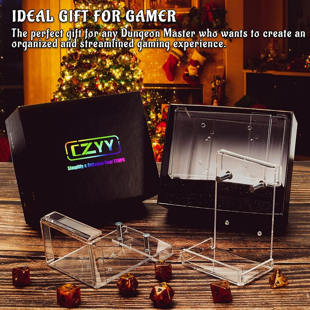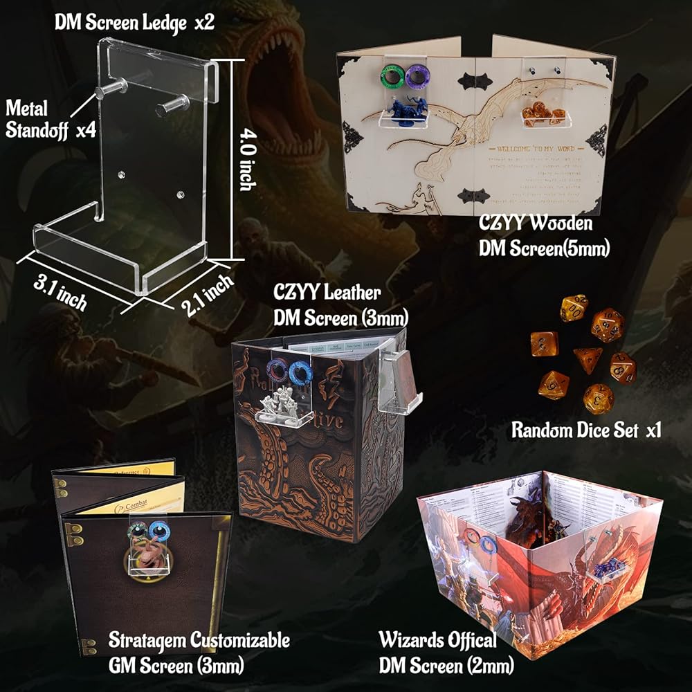 As a bonus, each set of DM Screen Ledges includes a random dice set to enhance your gaming experience. Additionally, the package contains 4 metal standoffs that can be easily installed into the four pre-drilled holes of each DM Screen Ledge, allowing you to store condition rings conveniently.