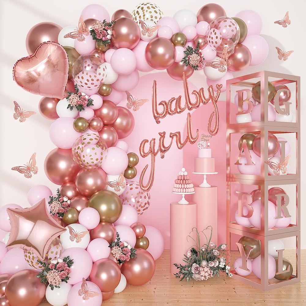 Baby Shower Decorations for Girl: 4pcs baby boxes, 1 set 26 Letters, 1 set of "Baby" letters, 12pcs 3D butterfly, 12''balloon(5rose gold, 5baby pink, 3rose gold confetti, 3gold confetti), 10''balloon(5gold metallic,10rose gold metallic,10white,10baby pink), 5''balloon(15rose gold metallic,15baby pink), 1pcs baby girl foil balloon, 1pcs 18'' heart foil balloon, 1pcs 18'' star foil balloon, 4pcs balloon tools. Rich balloon composition to satisfy all needs for your girl baby shower decorations.