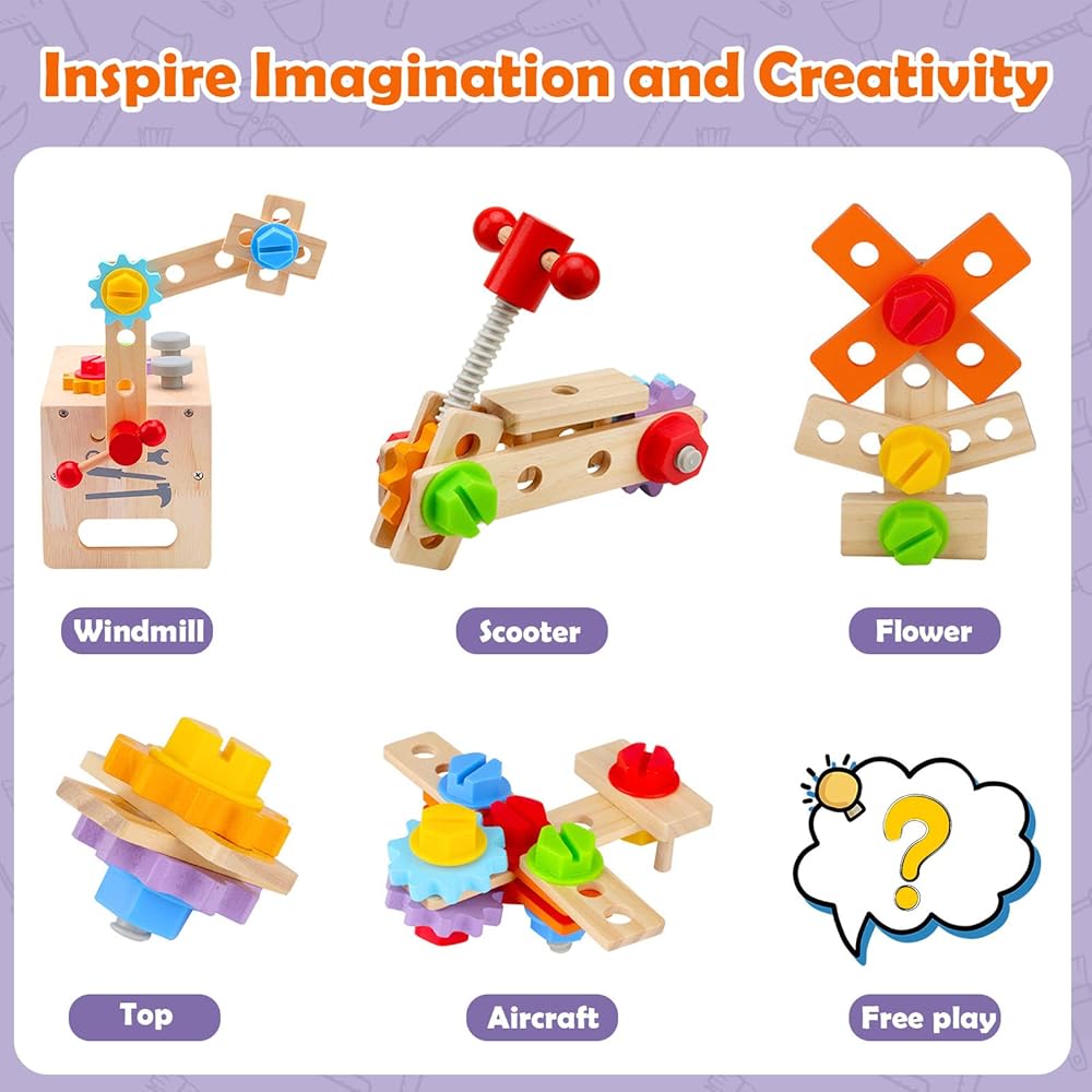 【Educational Construction Toy】 Wooden toy tools set can be assembled into a variety of interesting shapes such as flowers, windmill, helicopter, airplane, car and more. It stimulates children's imaginational creativity and improves their logical thinking skills. Meanwhile the toddler tool set encourages children to learn about construction and develops an interest in building.