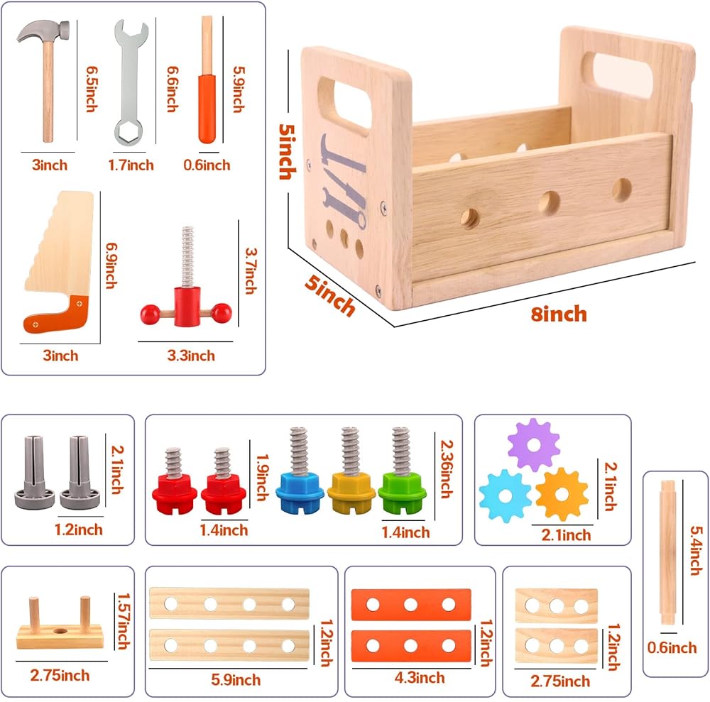 【Quality Materials】 The wooden toy tools kit are made from high quality, sturdy solid wood and sized to fit small hands. The surface is smooth and burr-free, all the edges are designed with rounded corners. Allows children to imitate their parents and protect their little hands from injury when using the tools.
