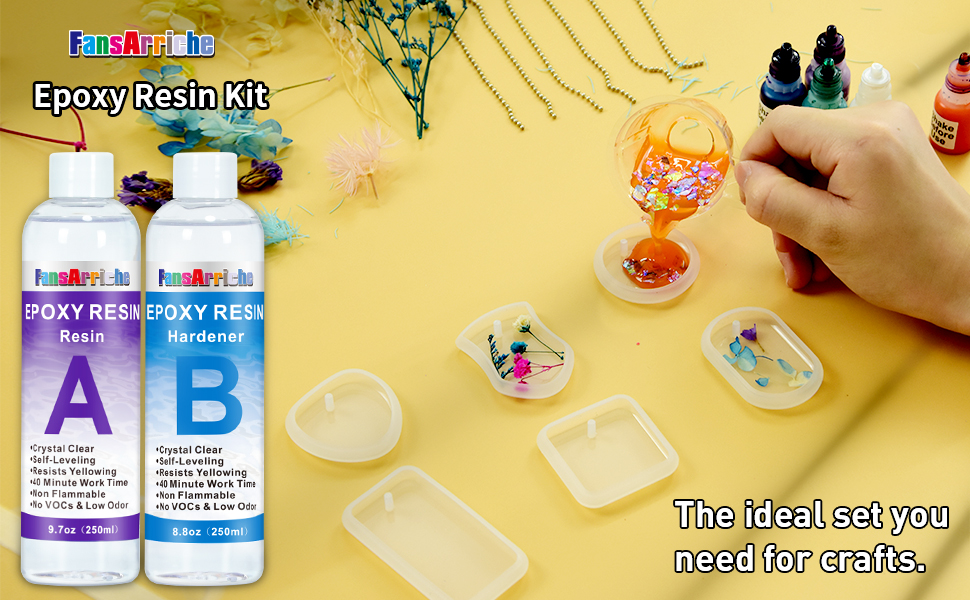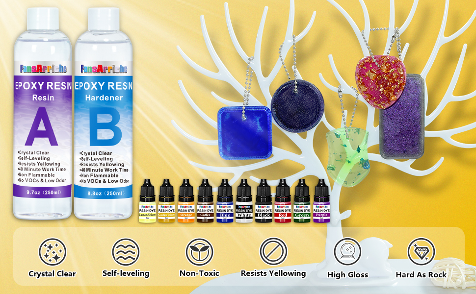 【What You Get】FansArriche epoxy resin kit includes 250ml bottle of resin and 250ml bottle of hardener, 6 different shapes of moulds and 6 key chains, 2 glitters, 2 measuring cups, 2 wooden sticks, 2 droppers, 4 gloves, 10 resin pigments (White, Blue, Purple, Black, Green, Golden Yellow, Red, Lemon Yellow, Orange, Coffee) and 1 instructions manual, which is very suitable for professional artists or beginners.