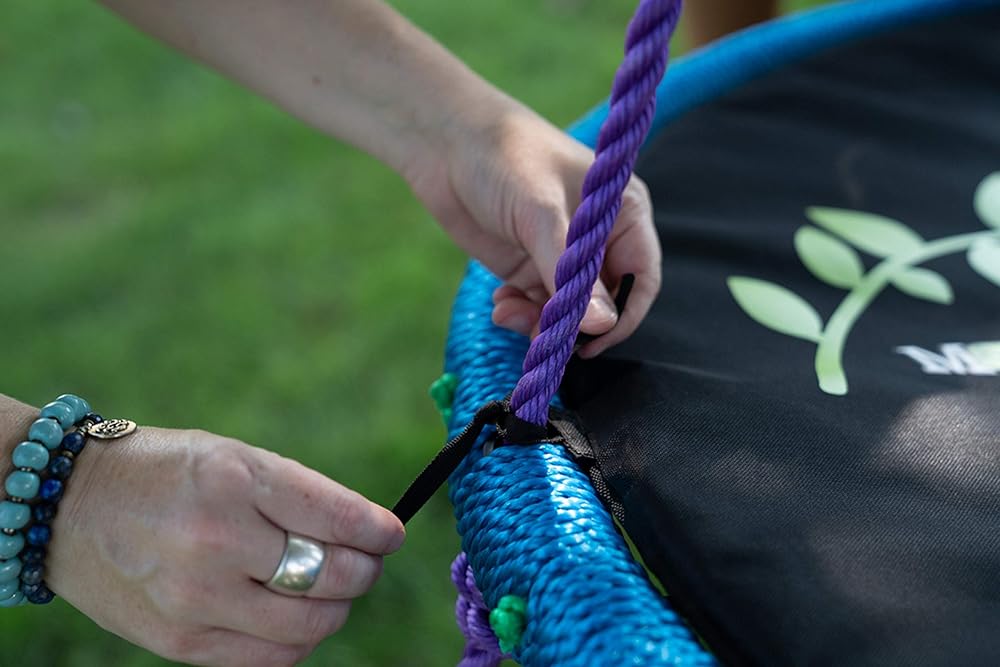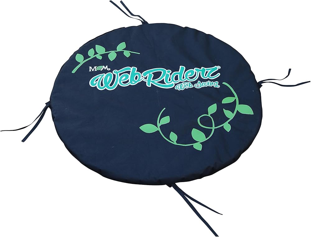 Web Riderz swings are a great outdoor toy for enhancing sensory integration and now offer an accessory cushion. For riders wanting additional support with an extra layer of cushioned seating or the visual comfort of a solid surface platform, the Web Riderz cushion is an easy accessory to simply attach/detach to your swing. Three layers engineered for outdoor use, the 33" diameter cushion sits right inside the circular platform and secures itself with four sets of tie-strings that can be secured to the four hanging ropes. The outer layer is a screen printed PVC backed polyester delivering a quick-dry surface, layered with a non-woven fabric to further protect the one-inch thick dry-fast foam layer from mold and mildew.