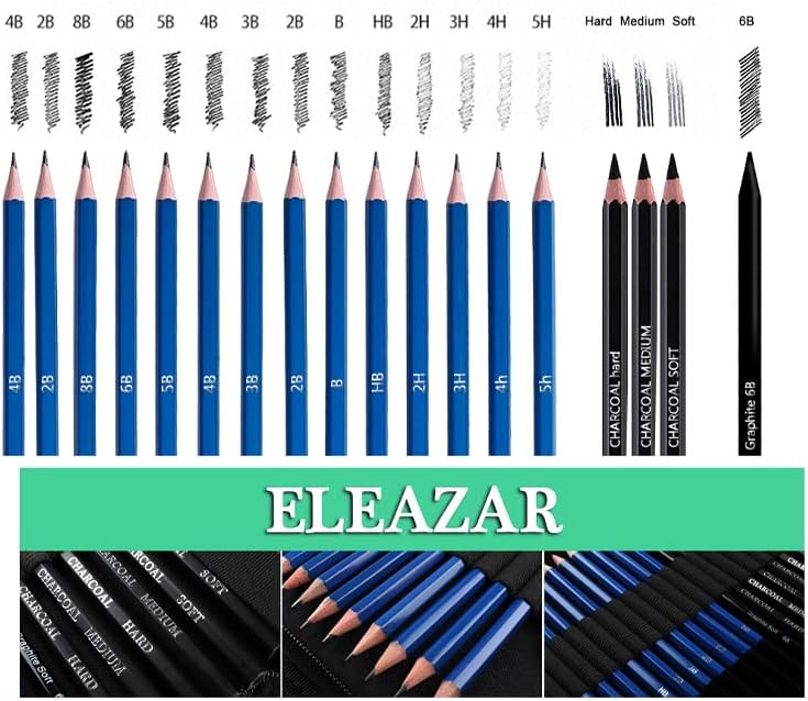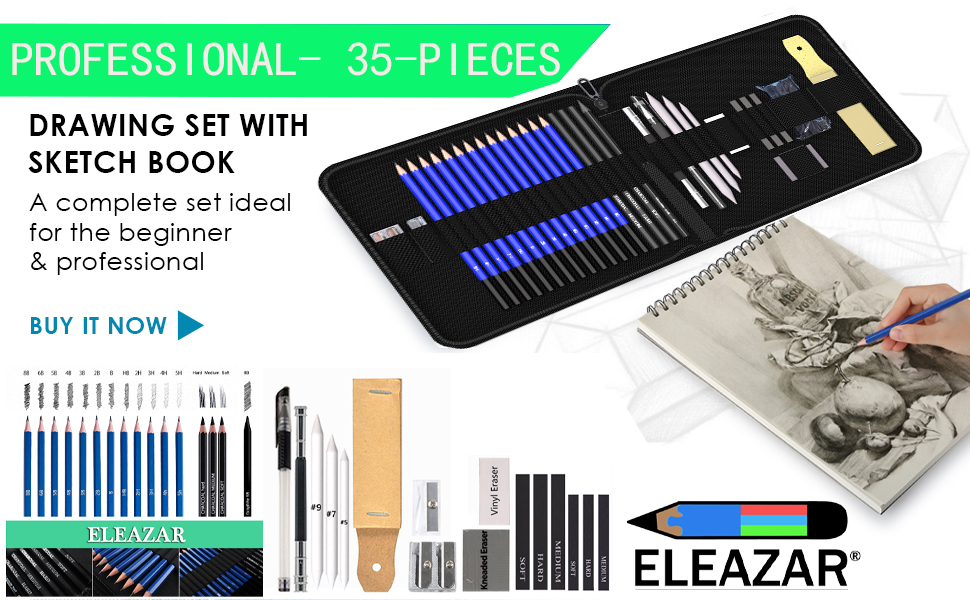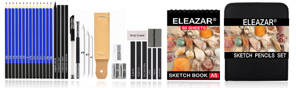 ELEAZAR35 Drawing Pencil Set in a portable zippered case (with 50-page A5 sketchbook) Includes sketching pencils and accessories for children, adults, beginners and professionals