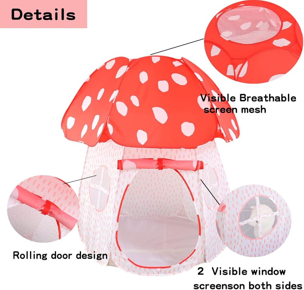 🍄[Unique design] Our Pop Up game tent does not require you to spend more time to assemblet. The shape of the mushroom allows your child to enjoy the independent privacy inside the mushroom house. The top has a transparent mesh screen, air circulation, more breathable. Play inside will not feel stuffy, the side of the open 2 mesh windows, easy for adults to see the children in the mushroom tent inside the situation.