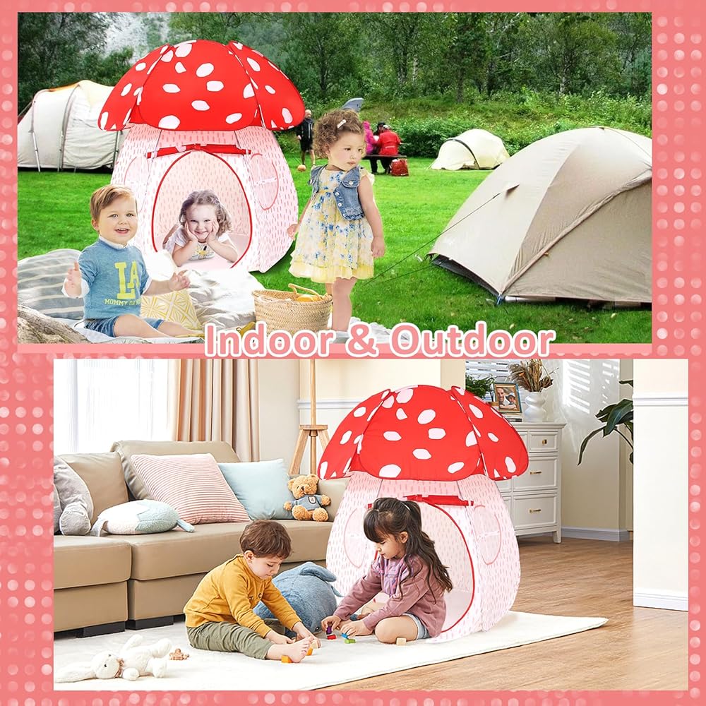 🍄[Fabric and Size] Our mushroom tents are made of high-quality and water-resistant polyester fabric.This kids tent indoor measure are 57''H*43''D, fits up to 3 kids. It is perfect for their pretend play. Also suitable for one kid sleeping, reading, imagining, toy storage, etc
