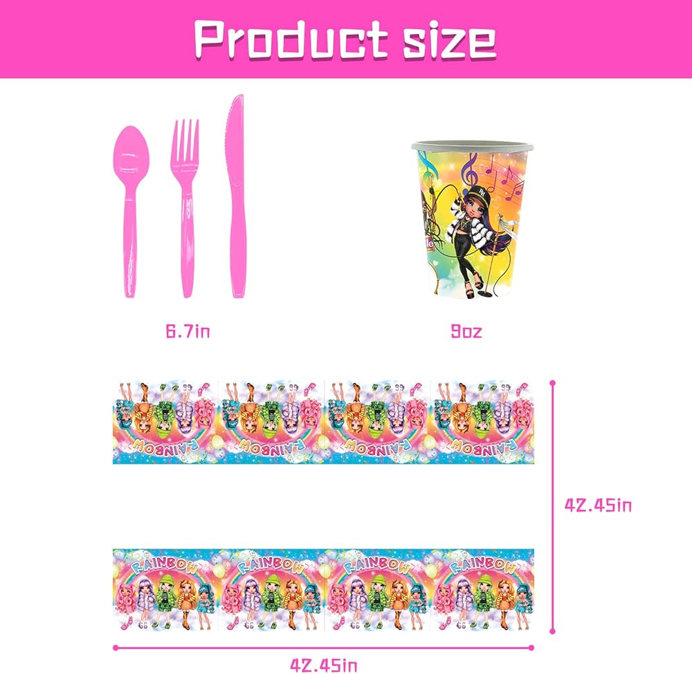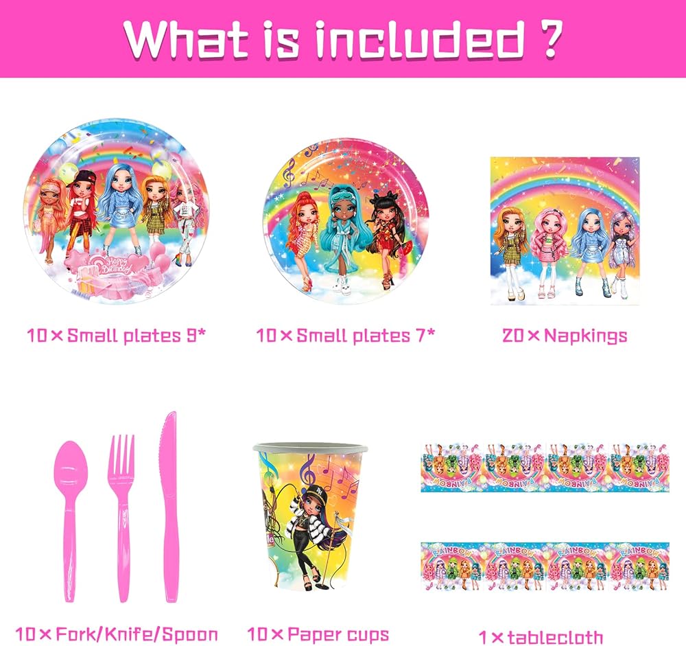 Include: This Rainbow Doll party decoration set includes 10 9" paper plates, 10 7" paper plates, 10 plastic forks, 10 knives, 10 spoons, 10 paper cups, 20 paper napkins, and 1 tablecloth.