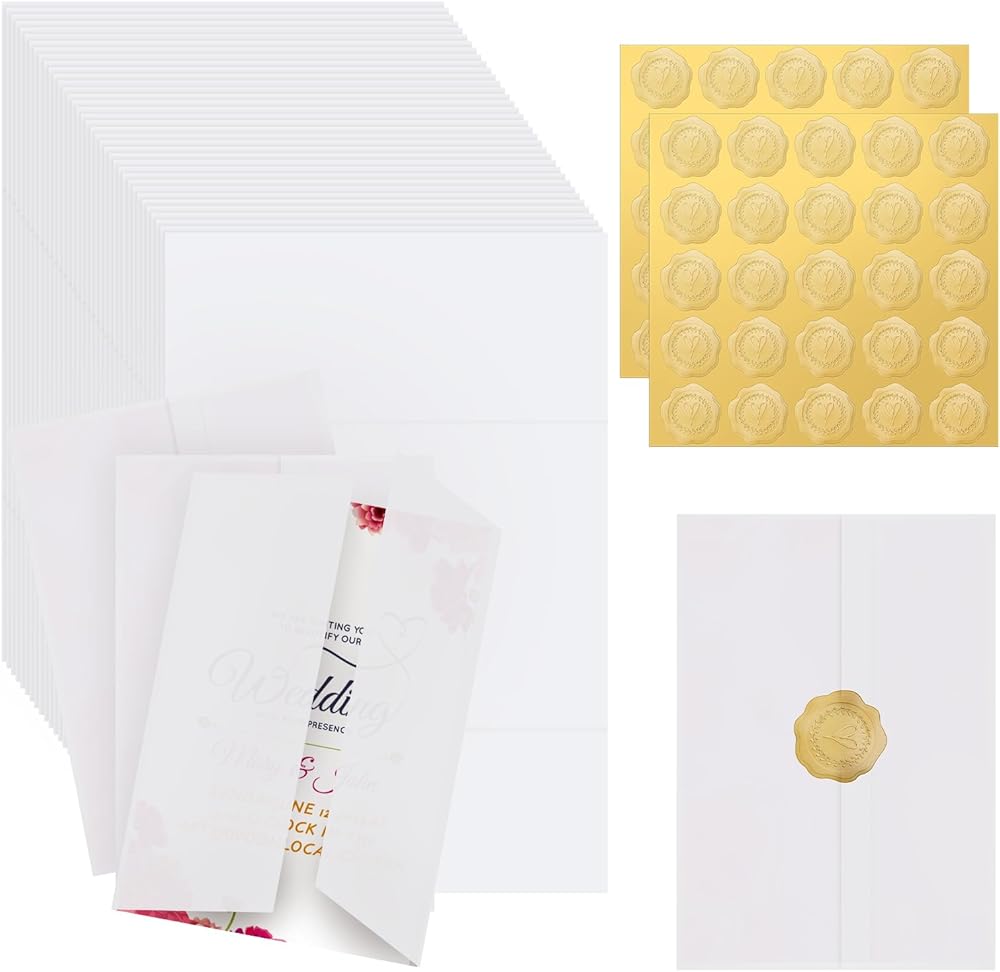 【Invitation Sleeves Set】150Pcs pre-folded vellum paper, Size: 5 x 7''; 150Pcs Seal Stickers, diameter:1.34 inchs. Enough quantity to meet your daily or party needs, and the invitations will become more attractive.