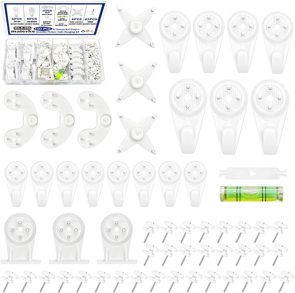 Package:You will receive a plastic box containing:62PCS mini picture hooks,10PCS small picture hooks,8PCS medium picture hooks,6PCS large picture hooks,3PCS heavy duty picture hooks,3PCS circular picture hooks,6PCS four-corner picture hooks,1PC auxiliary clip,1PC mini level.
